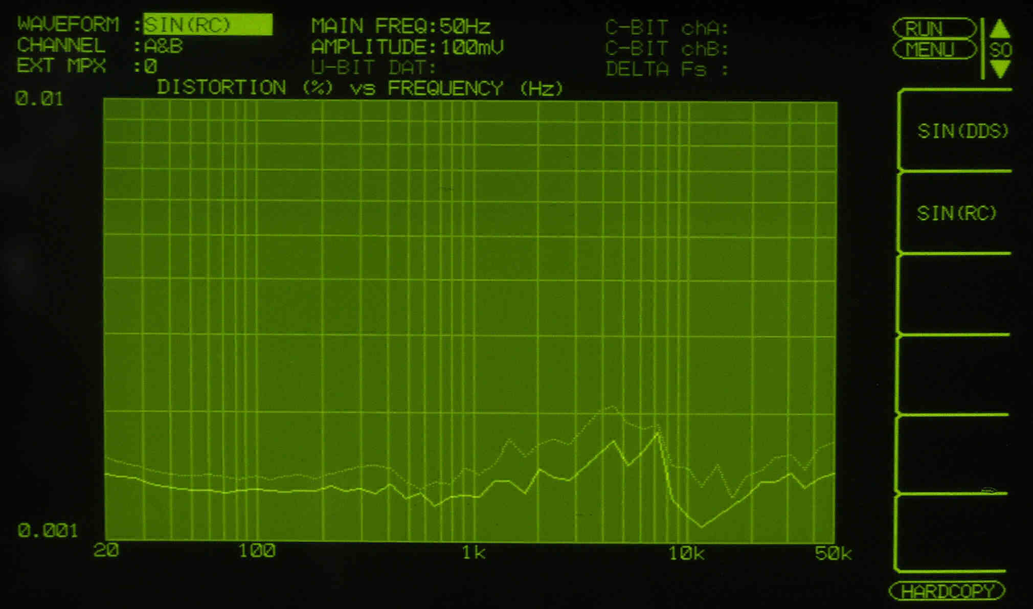 E32. 出力電圧1V 歪み率=0.02%(測定レンジ=0.1%) MM1(PHONO−1)入力 400HZ。