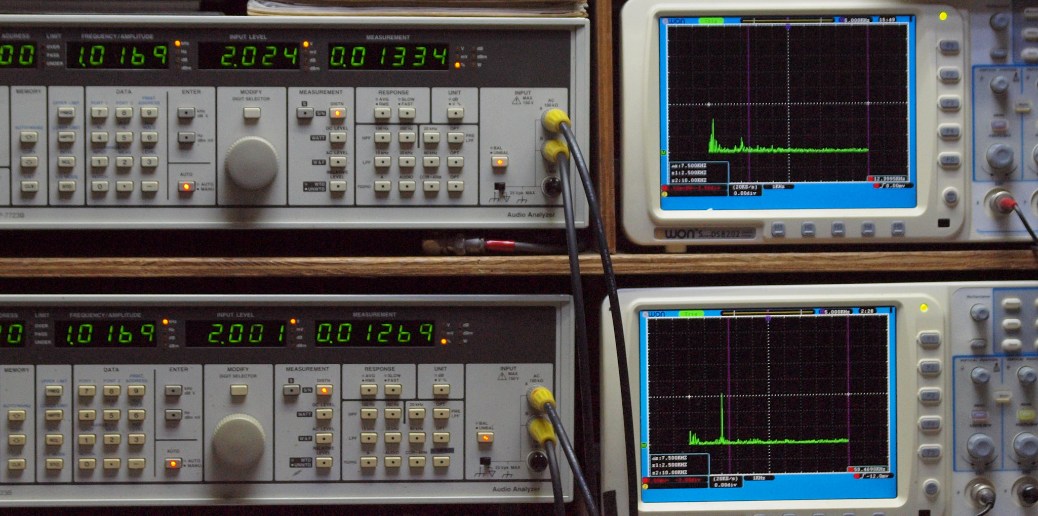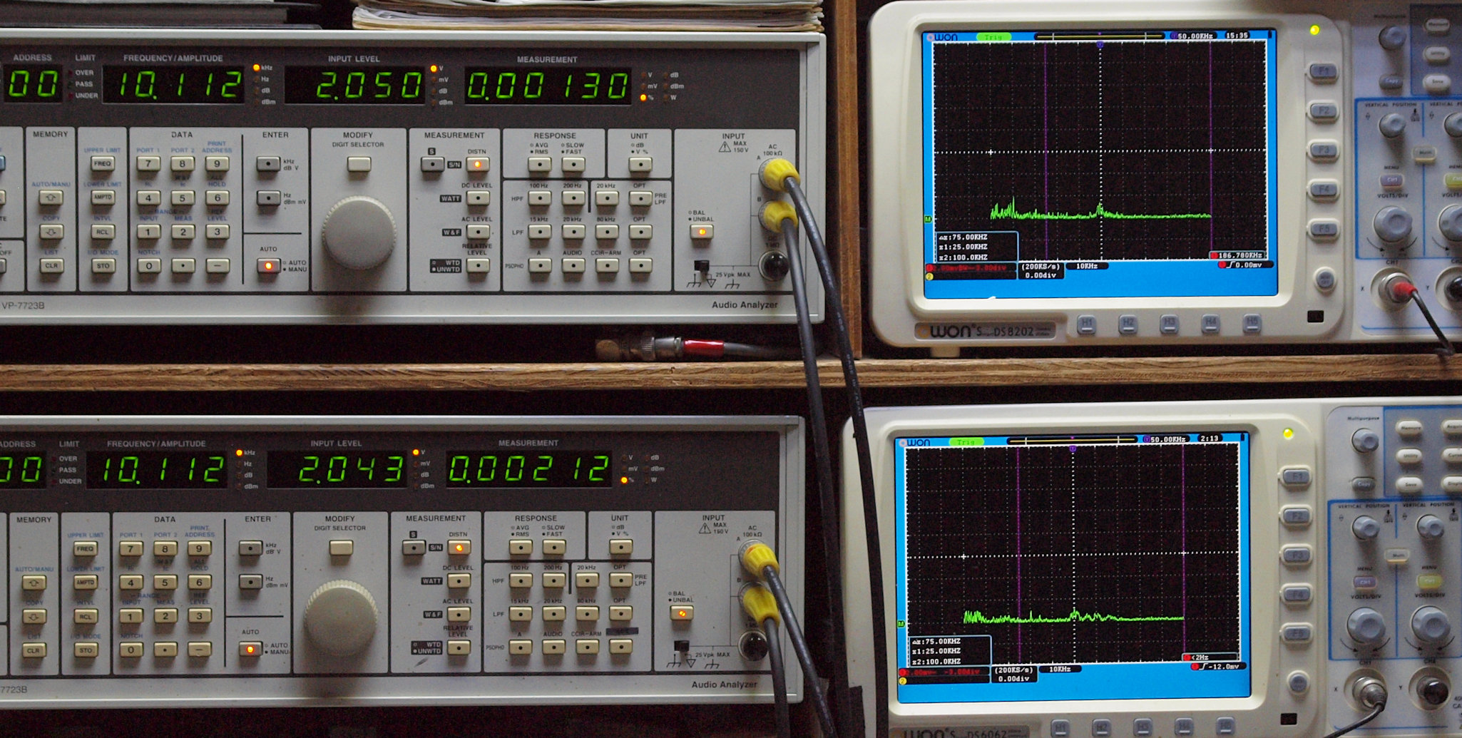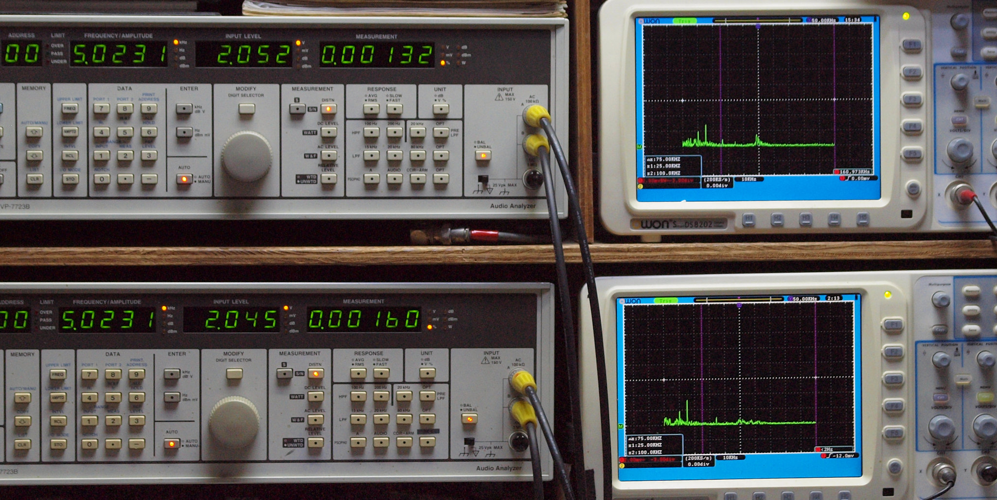 上段右端 VP−7723Bの基本波除去出力を「owon SDS8202(200MHZ)」で「FFT分析」表示。