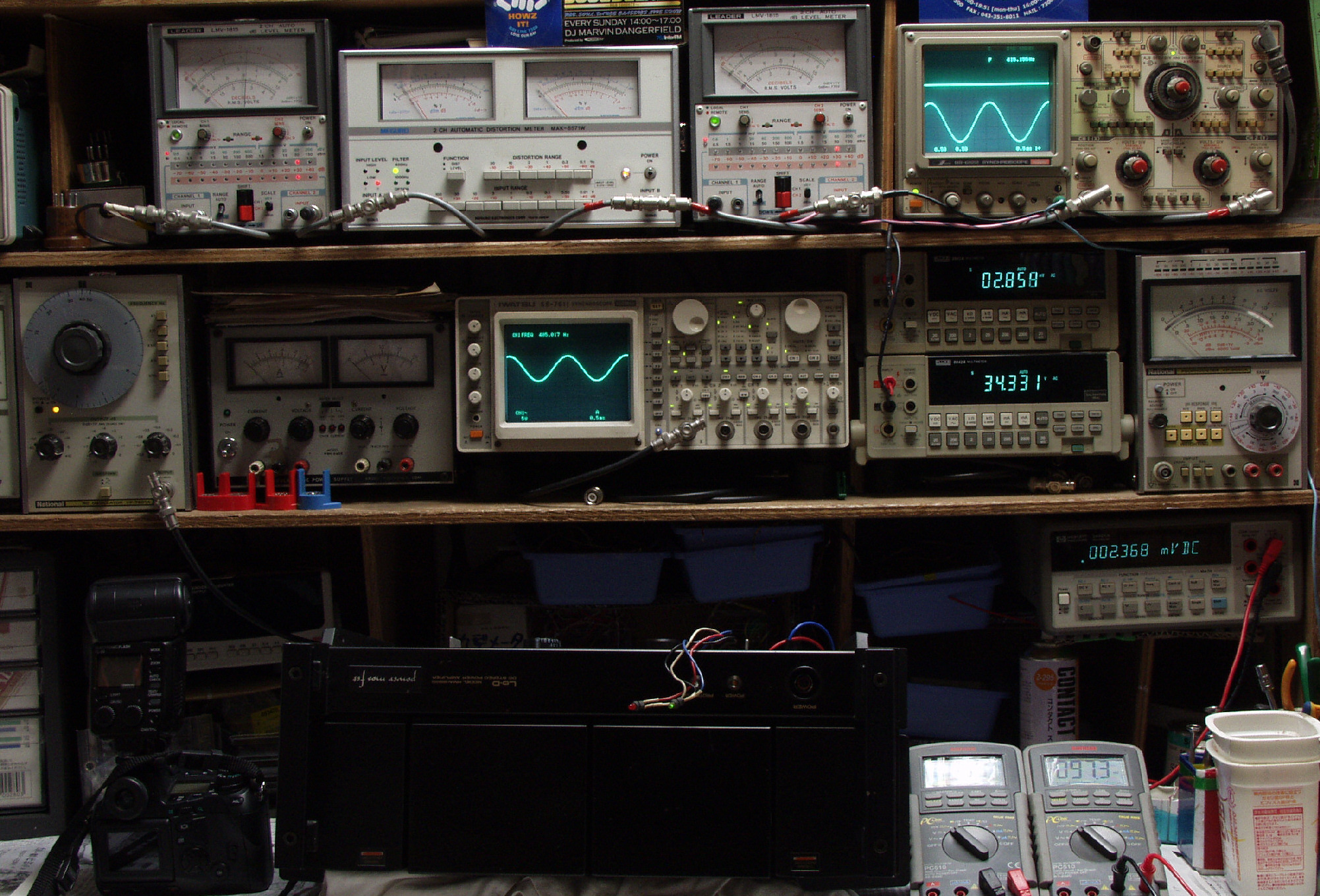 上段中左 歪み率計=SP出力の歪み率測定 左メータ=L出力、右メータ=R出力
