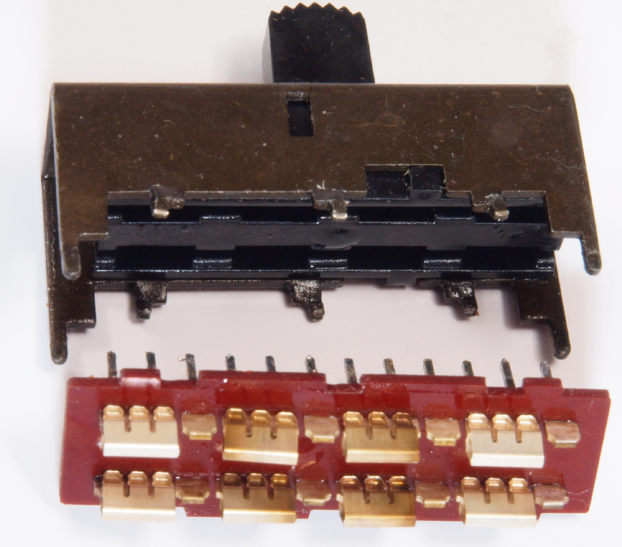 | C6B. 修理中 RCA端子基板の切り換えSW分解。 使用するのは端の1回路のみ、内側の綺麗な接触子と交換して組む。 |