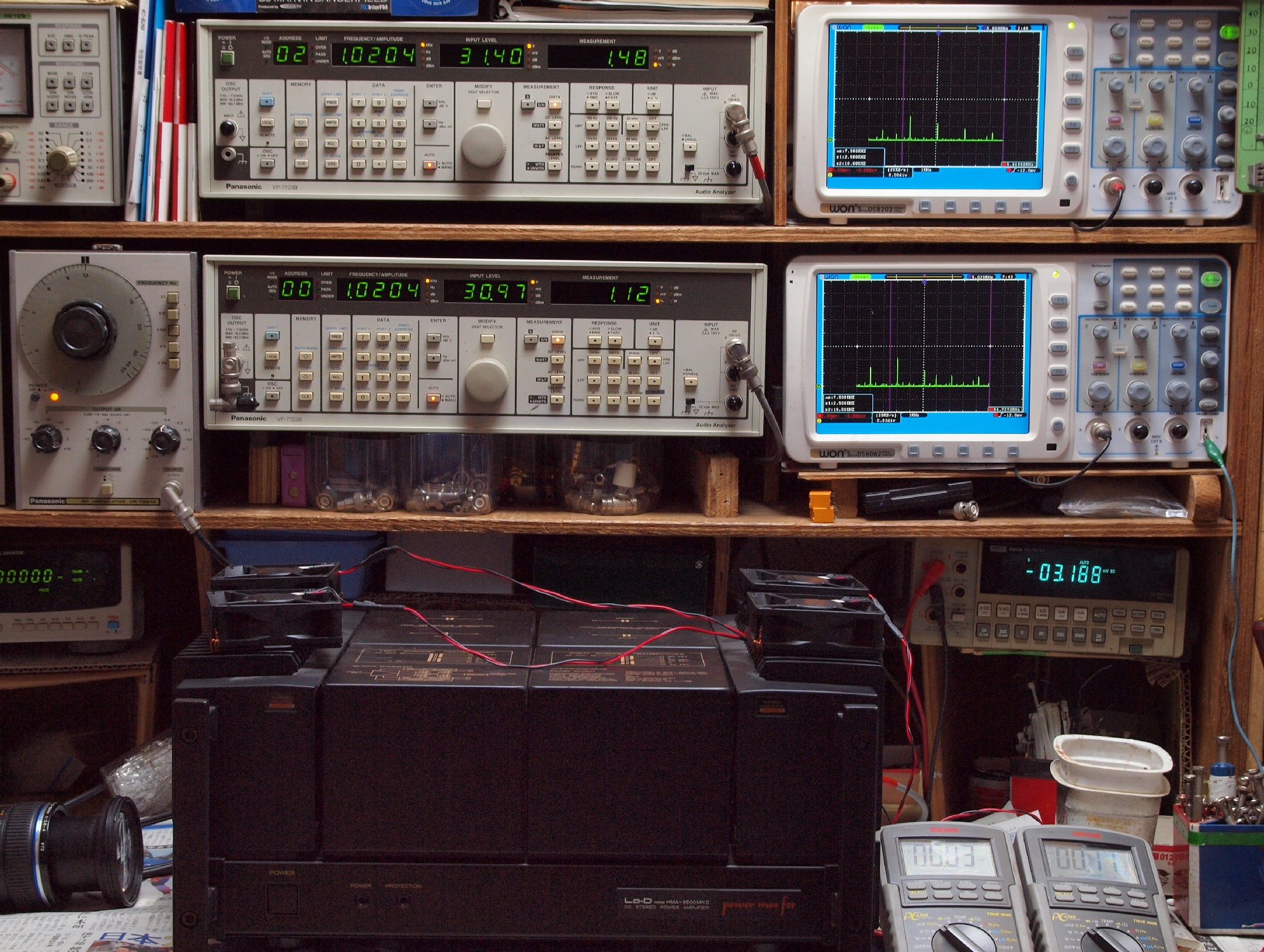 | E. 測定・調整。 画像をクリックすると、大きく(横幅2050ドット)表示されます。 E1. 出力・歪み率測定・調整 「見方」。 上段中 右側SP出力を「Audio Analyzer Panasonic VP−7723B」により測定。 表示LED、 左端=メモリーNo、 中左=周波数測定、 中右=出力電圧測定、 右端=歪み率測定。 上段右端 VP−7723Bの基本波除去出力を「owon SDS8202(200MHZ)」で「FFT分析」表示。 下段中 左側SP出力を「Audio Analyzer Panasonic VP−7723B」により測定。 表示LED、 左端=メモリーNo、 中左=周波数測定、 中右=出力電圧測定、 右端=歪み率測定。 下段右端 VP−7723Bの基本波除去出力を「owon SDS6062(200MHZ)」で「FFT分析」表示。 下段左端 オーディオ発振器 VP−7201A より50Hz〜100kHzの信号を出し(歪み率=約0.003%)、ATT+分配器を通し、AMPに入力。 よって、ダイアル設定出力レベルより低くなります。測定機器の仕様や整備の様子はこちら、「VP−7723B」「VP−7201A」。 FFT画面の見方はこちら。 |