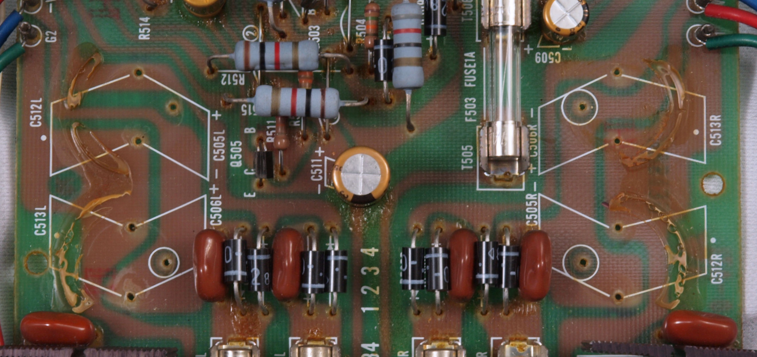 | C52. 修理中 電源基板、電解コンデンサー固定用の接着材が取り除かれていない、当時は溶媒にトルエンが使用されており、銅を腐食する。 |
