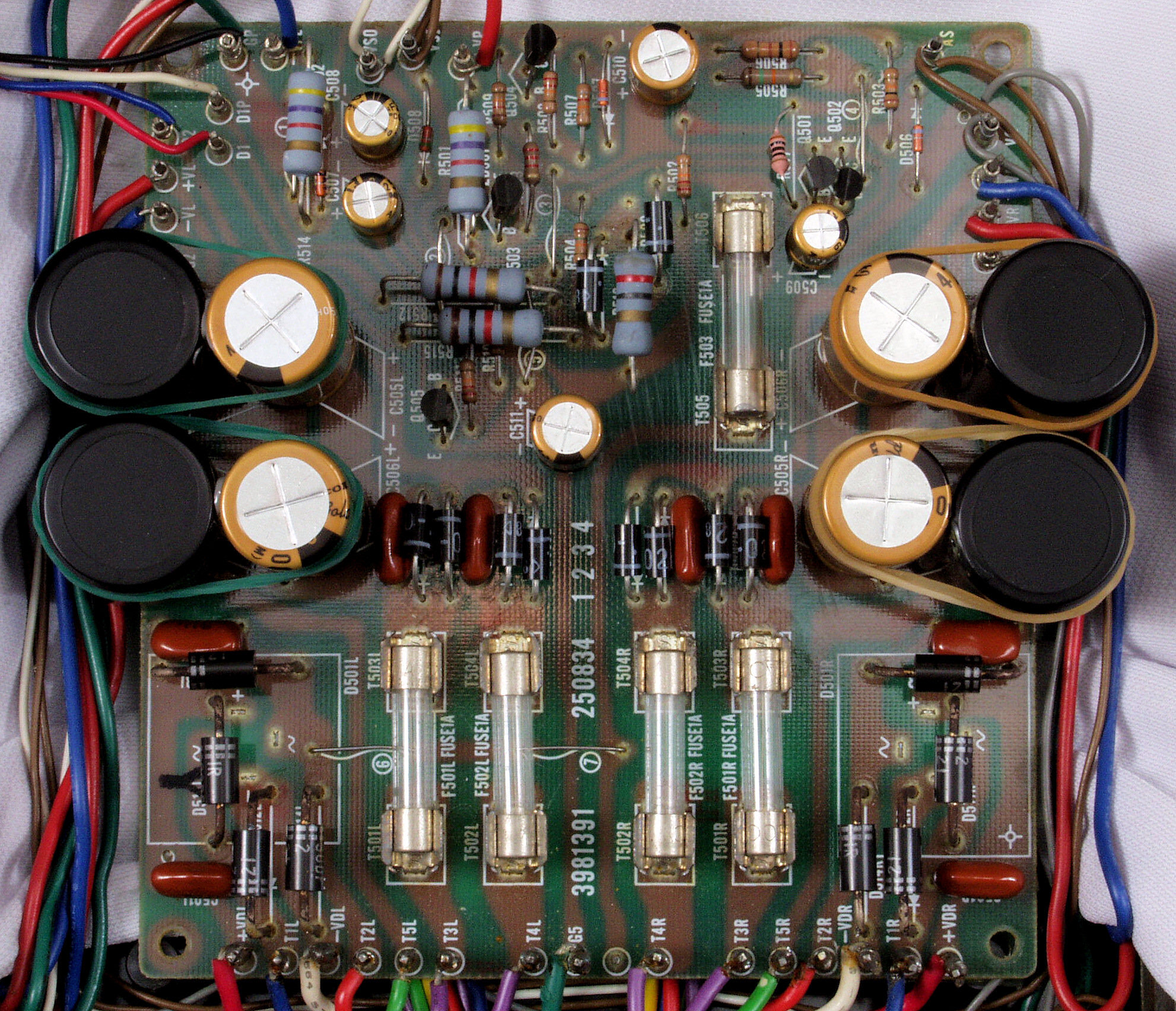 | C52. 修理後 電源基盤 フューズ入り抵抗全部、電解コンデンサー9個、整流ダイオード10個交換、輪ゴムは接着材が固まるまで使用 |