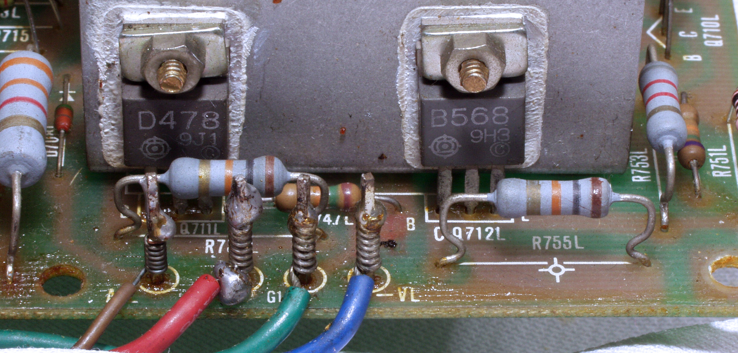 | C512. 修理中 L側ドライブ基板、 上=大型抵抗に交換、下=正規のフューズ入り抵抗。 |