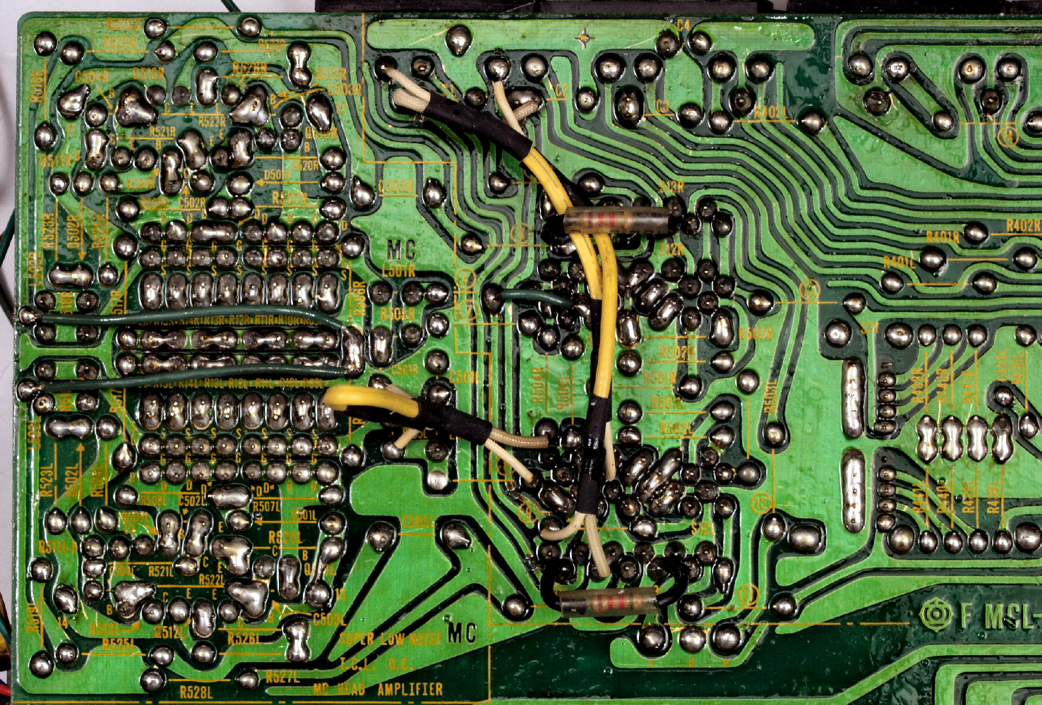 C2D. 修理(半田補正)後 EQ−HEAD-AMP部基板裏。  全ての半田をやり修す。