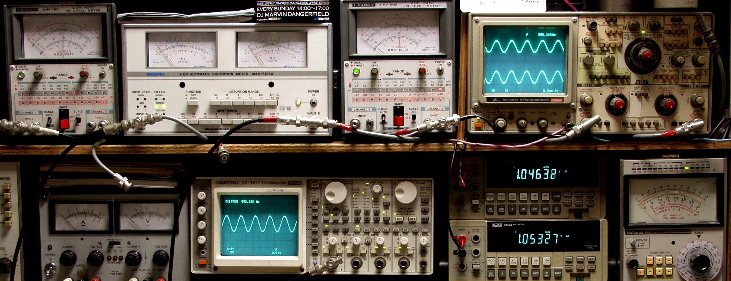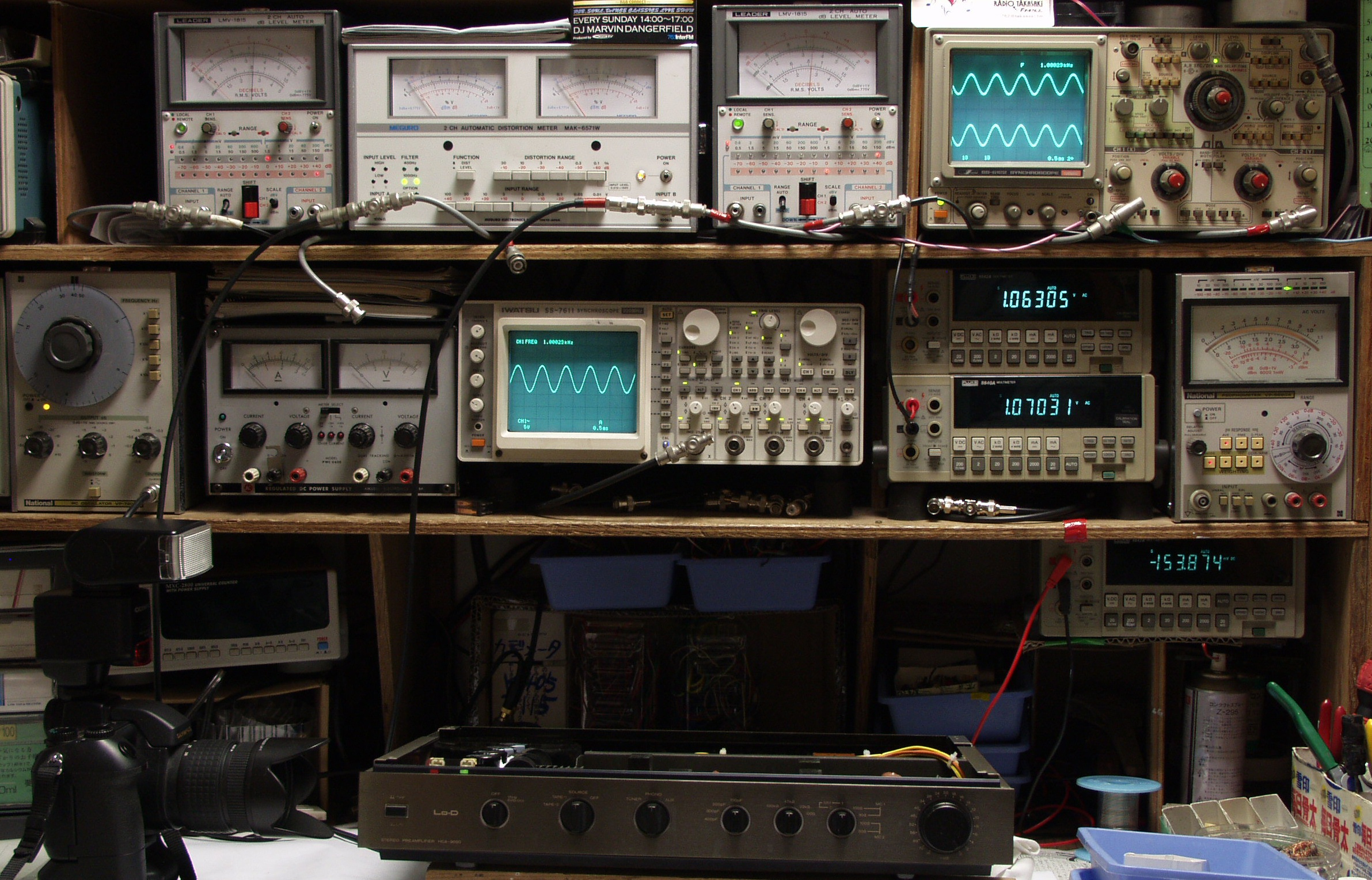 上段中左 歪み率計=出力の歪み率測定 左メータ=L出力、右メータ=R出力