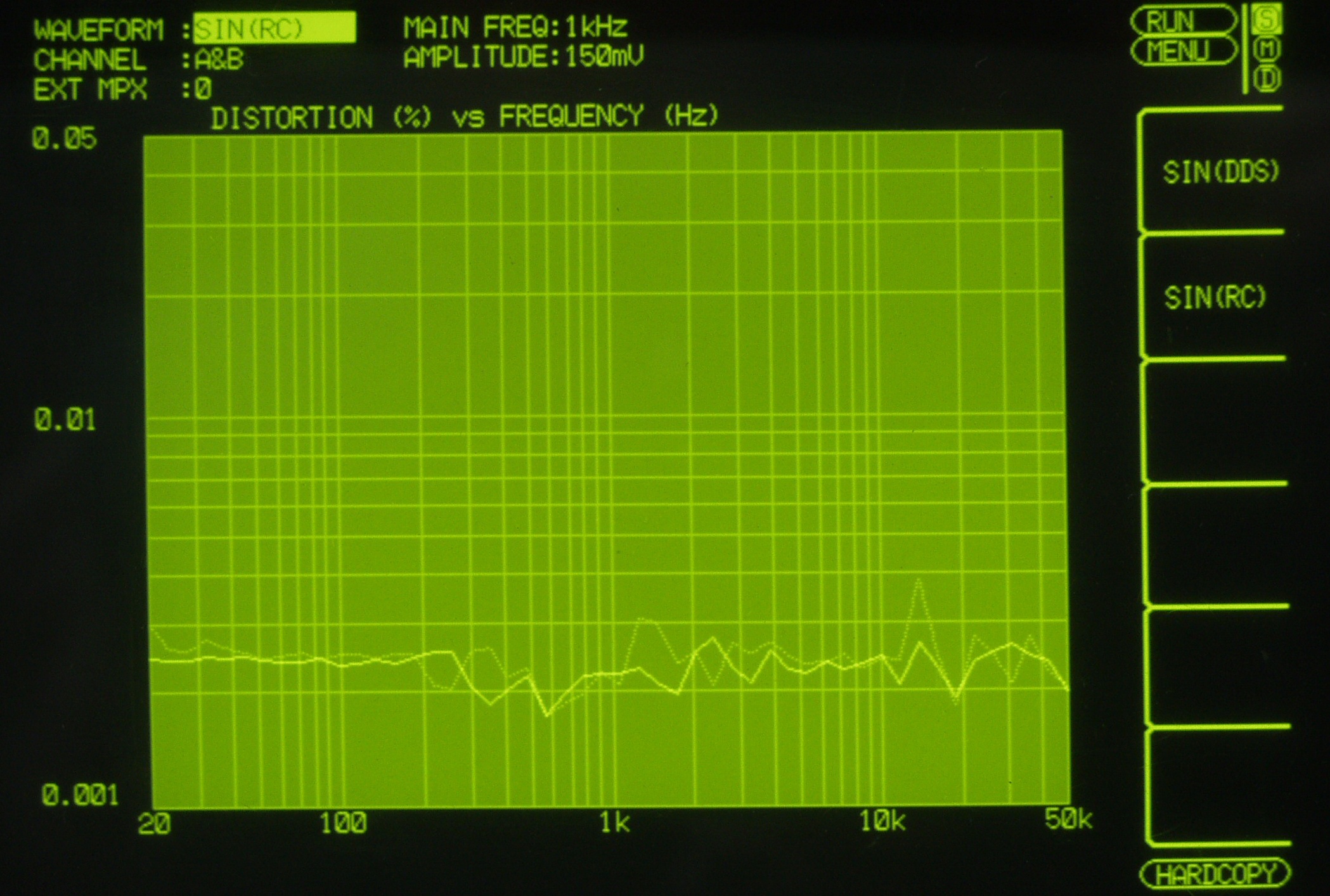 AUX入力端子へ150mV一定入力 VRはmax  左出力=薄(細い)色 右出力=濃い(太い)色