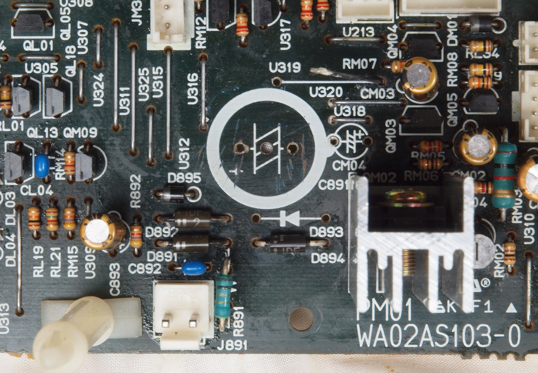 C92. 修理前 右側温度感知TR(トランジスター)基板裏&フアン接続基板裏。