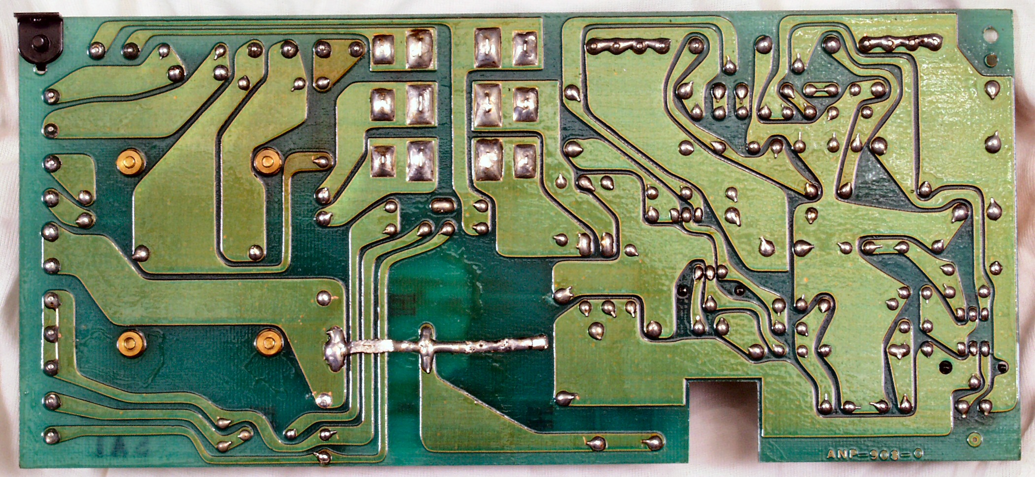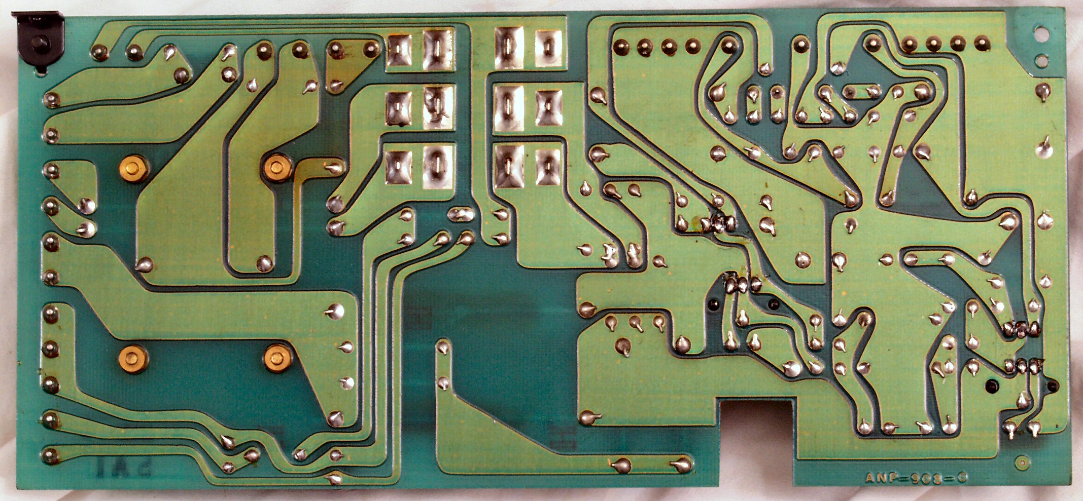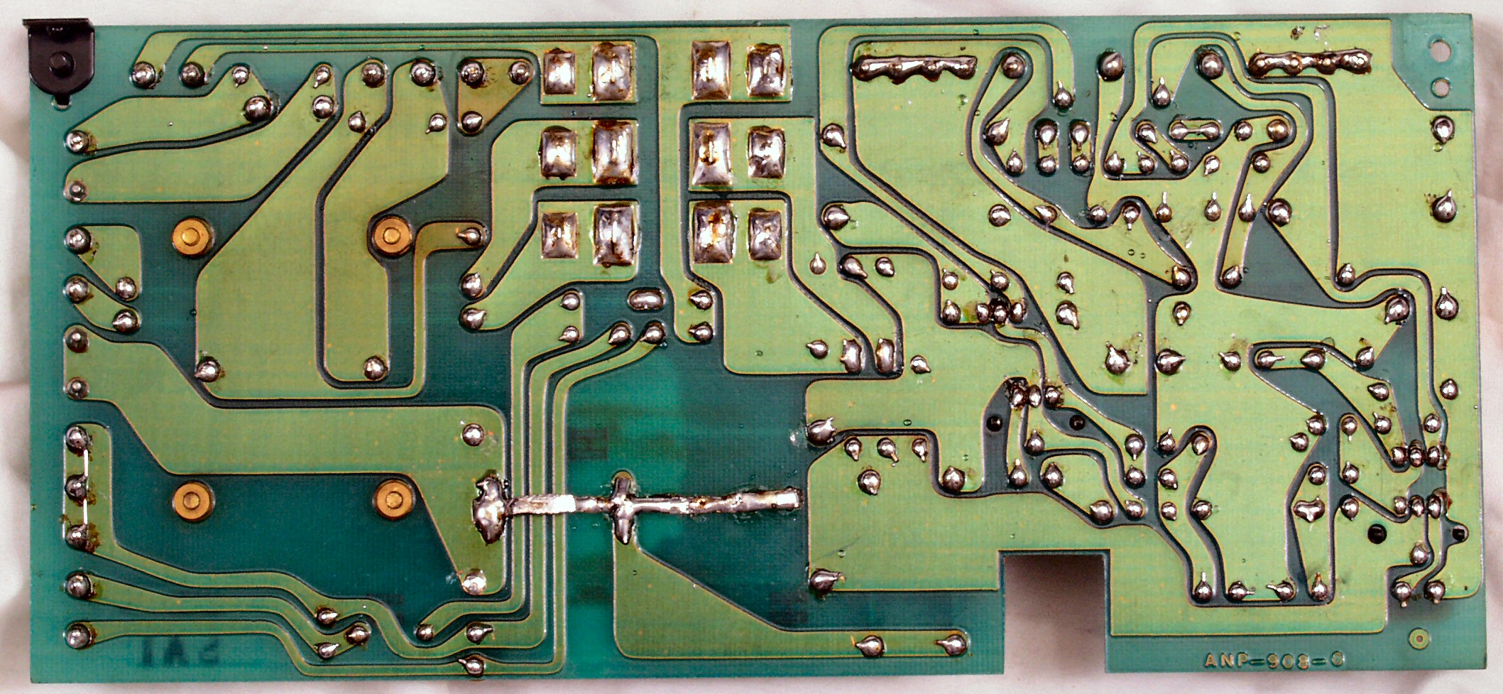 | C34. 修理(半田補正)後 定電圧電源基盤裏 半田を全部やり直す、銅箔は厚いので熱容量の大きいハンダ鏝使用 | ||||||||||||||||||||||||||||||||||||||||||