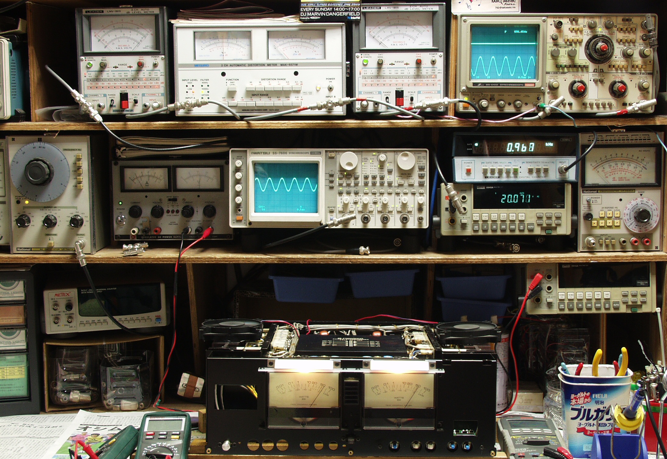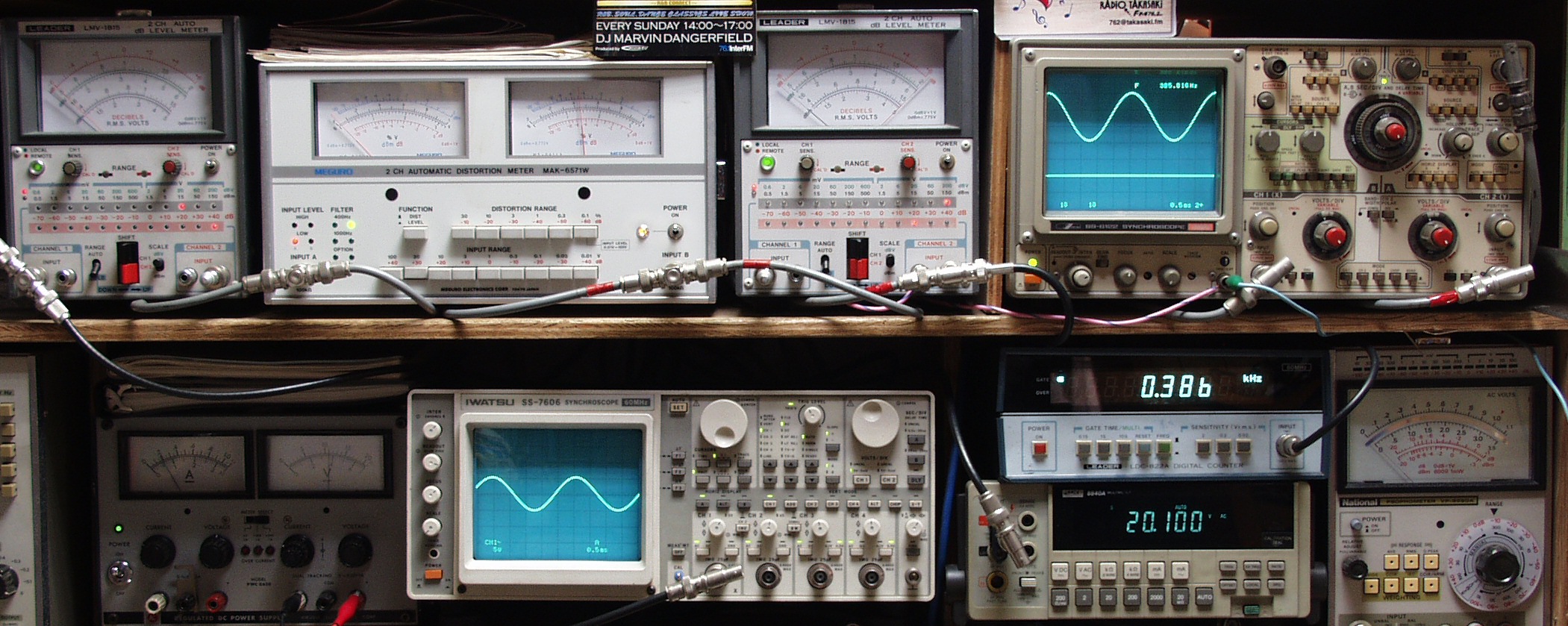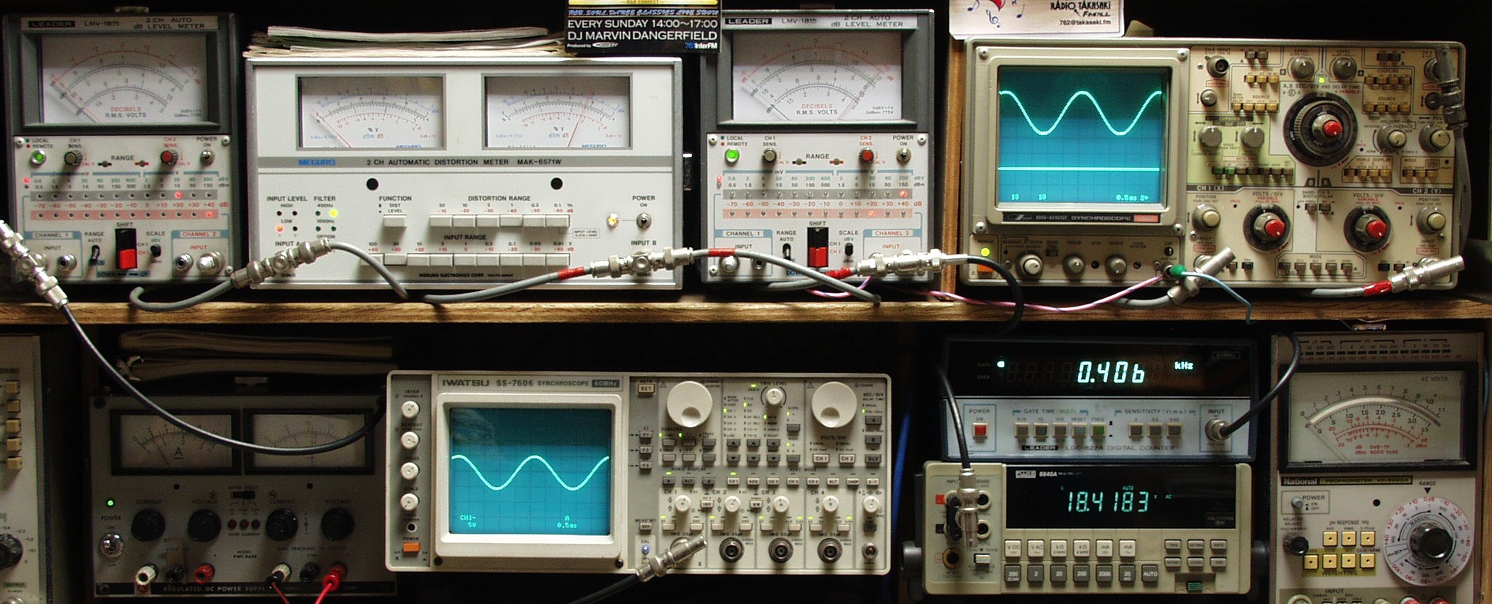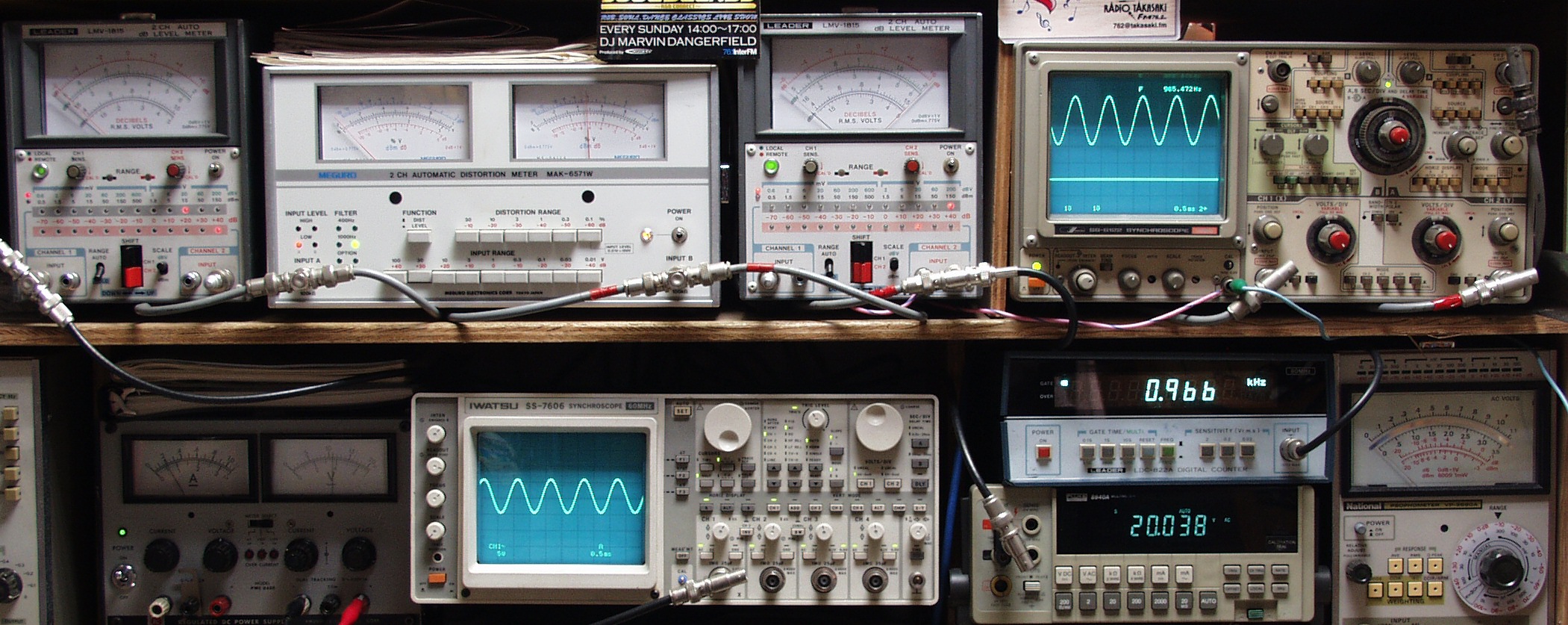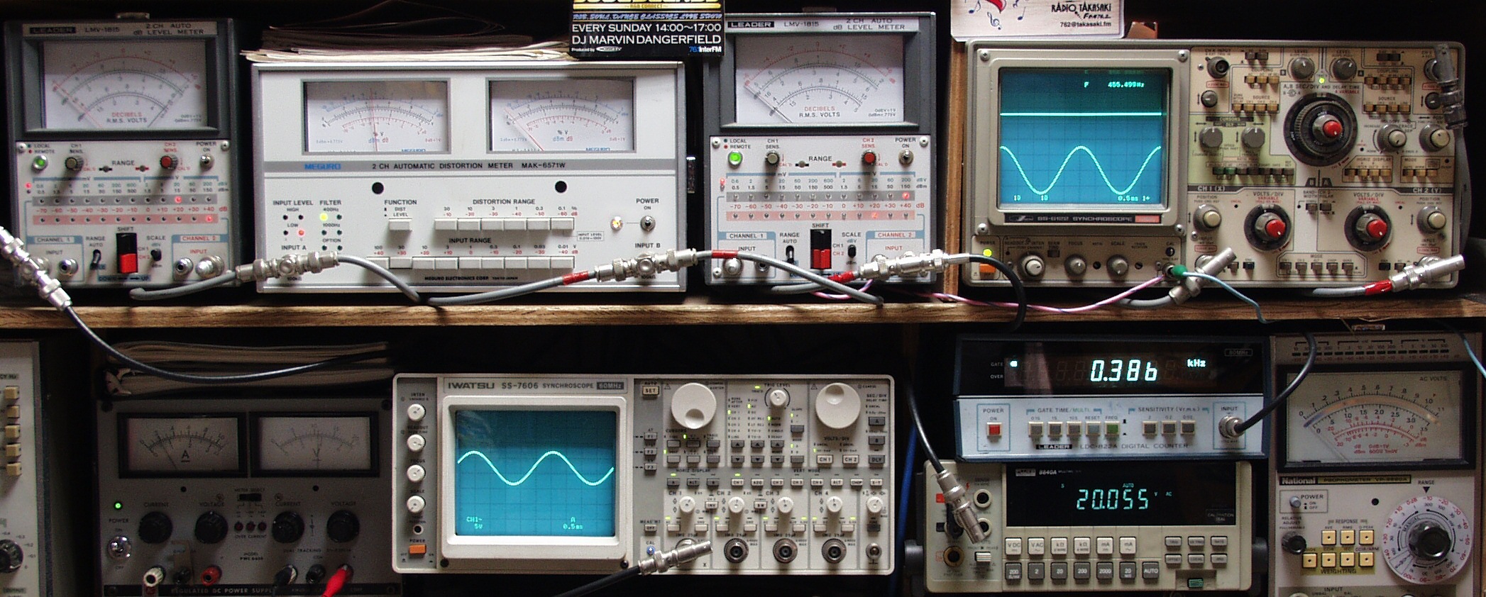 | T. 修理前点検測定 T1. 出力・歪み率測定 <見方> 下左オーディオ発振器より400HZ・1KHZの信号を出し(歪み率=約0.003%)これをAMPに入力し、SPからの出力を測定 下中オシロ=入力波形(オーディオ発振器のTTLレベル) 下中右上=周波数計 下中右下デジタル電圧計=SP出力電圧測定RLは切り替えて測定 上左端電圧計=L側SP出力電圧測定、黒針のみ使用 上中左歪み率計=SP出力の歪み率測定 左メータ=L出力、右メータ=R出力 上中右=R側SP出力電圧測定、赤針のみ使用 上右端オシロ=SP出力波形 上=R出力、下=L出力 |