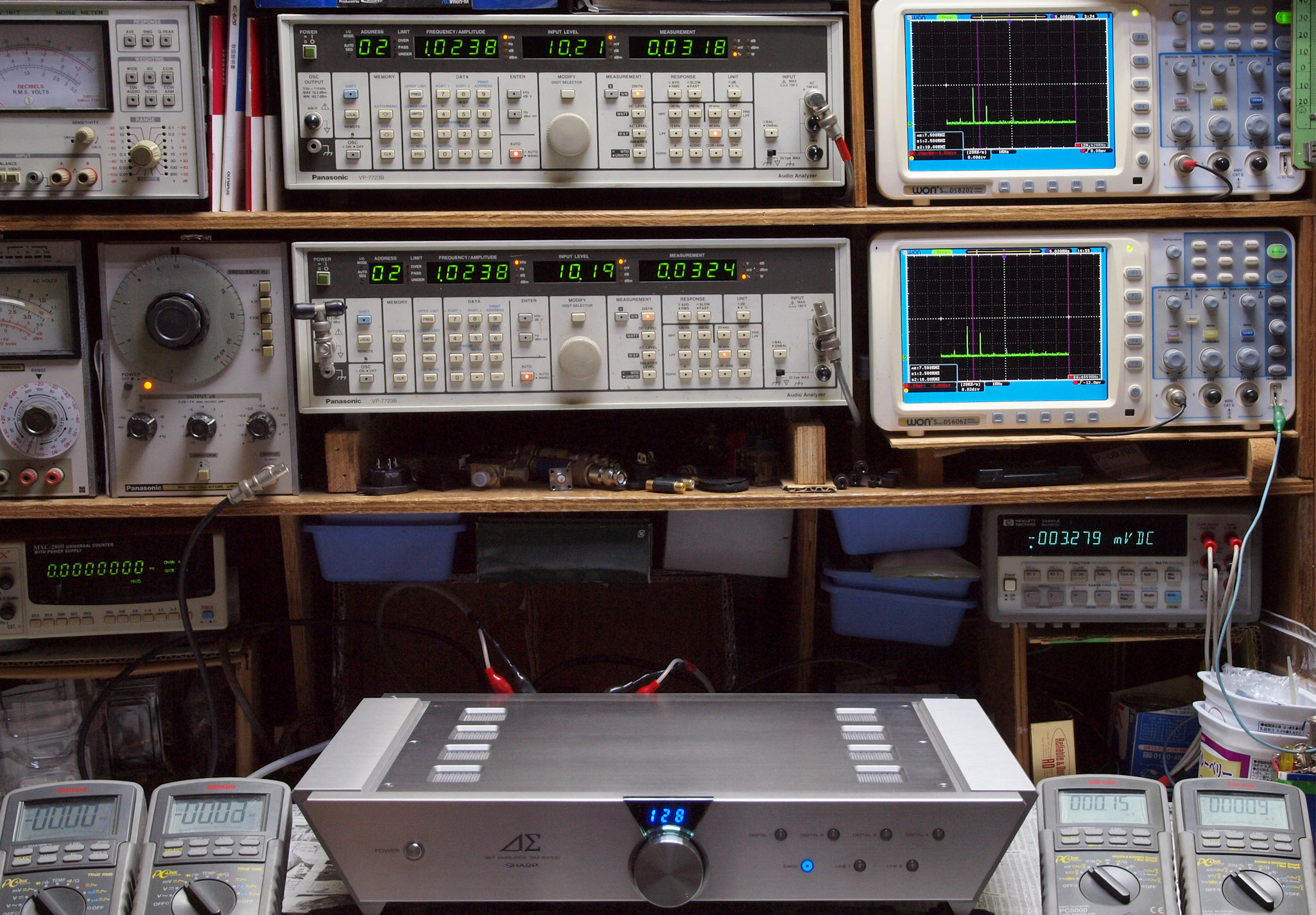 | E. 測定・調整。 画像をクリックすると、大きく(横幅2050ドット)表示されます。 E0. 出力・歪み率測定・調整 「見方」。 上段中 右側SP出力を「Audio Analyzer Panasonic VP−7723B」により測定。 表示LED、 左端=メモリーNo、 中左=周波数測定、 中右=出力電圧測定、 右端=歪み率測定。 上段右端 VP−7723Bの基本波除去出力を「owon SDS8202(200MHZ)」で「FFT分析」表示。 下段中 左側SP出力を「Audio Analyzer Panasonic VP−7723B」により測定。 表示LED、 左端=メモリーNo、 中左=周波数測定、 中右=出力電圧測定、 右端=歪み率測定。 下段右端 VP−7723Bの基本波除去出力を「owon SDS6062(200MHZ)」で「FFT分析」表示。 下段左端 オーディオ発振器 VP−7201A より50Hz〜100kHzの信号を出し(歪み率=約0.003%)、ATT+分配器を通し、AMPに入力。 よって、ダイアル設定出力レベルより低くなります。測定機器の仕様や整備の様子はこちら、「VP−7723B」「VP−7201A」。 FFT画面の見方はこちら。 入出力点検確認。 ライン1のアナログ入力、ライン2のバランス入力 、ライン出力点検確認済み。 デジタルNo1のST入力、デジタルNo2のBNCケーブル入力、デジタルNo3のRCAケーブル入力点検確認済み。 デジタルNo4の光ケーブル入力、デジタルNo5のSACD/1ビット入力(RCA入力)点検確認済み。 80kHz前後にクロック漏れが200mVPP(10mVrms)位あり、80kHzのローパスフイルターを挿入して測定。 仕様では、0.05%(1kHz、1W出力時) |