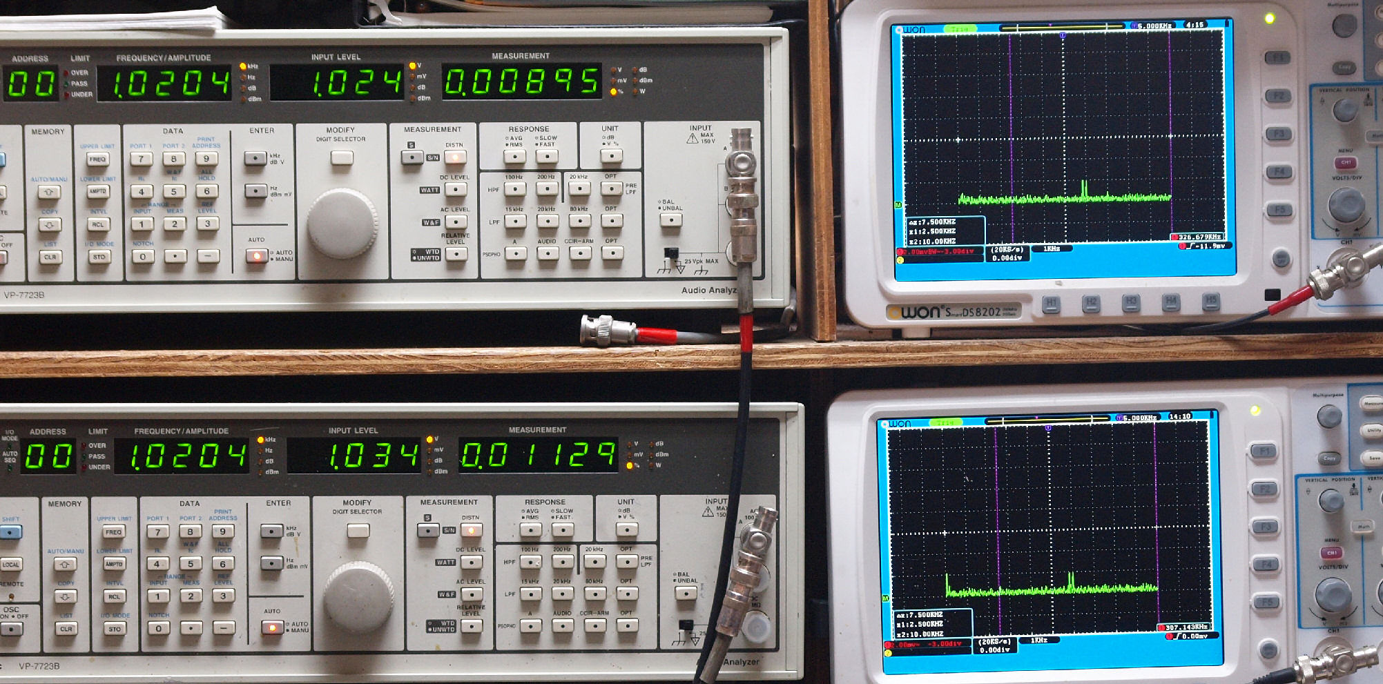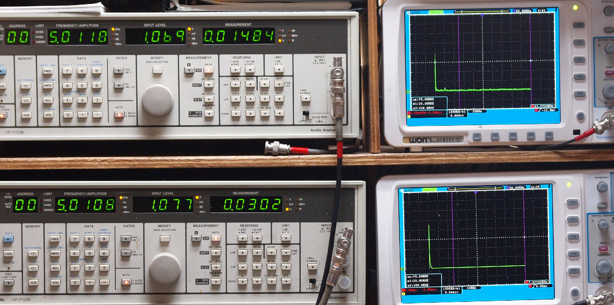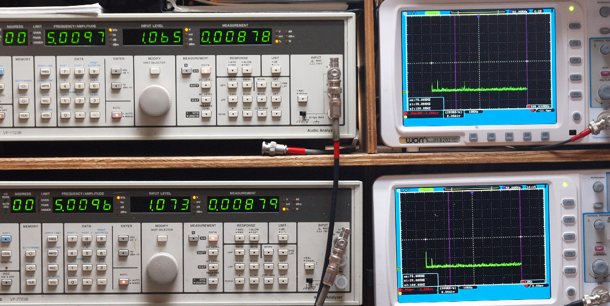 | E. 調整・測定。 画像をクリックすると、大きく(横幅2050ドット)表示されます。 E1. 出力・歪み率測定・調整、「電源電圧は50HZ 100V」。 「見方」。 上段中 右側出力を「Audio Analyzer Panasonic VP−7723B」により測定。 表示LED、 左端=メモリーNo、 中左=周波数測定、 中右=出力電圧測定、 右端=歪み率測定。 上段右端 VP−7723Bの基本波除去出力を「owon SDS8202(200MHZ)」で「FFT分析」表示。 下段中 左側出力を「Audio Analyzer Panasonic VP−7723B」により測定。 表示LED、 左端=メモリーNo、 中左=周波数測定、 中右=出力電圧測定、 右端=歪み率測定。 下段右端 VP−7723Bの基本波除去出力を「owon SDS6062(200MHZ)」で「FFT分析」表示。 下段左端 オーディオ発振器 VP−7201A より50Hz〜100kHzの信号を出し(歪み率=約0.003%)、ATT+分配器を通し、AMPに入力。 よって、ダイアル設定出力レベルより低くなります。測定機器の仕様や整備の様子はこちら、「VP−7723B」「VP−7201A」。 FFT画面の見方はこちら。 |