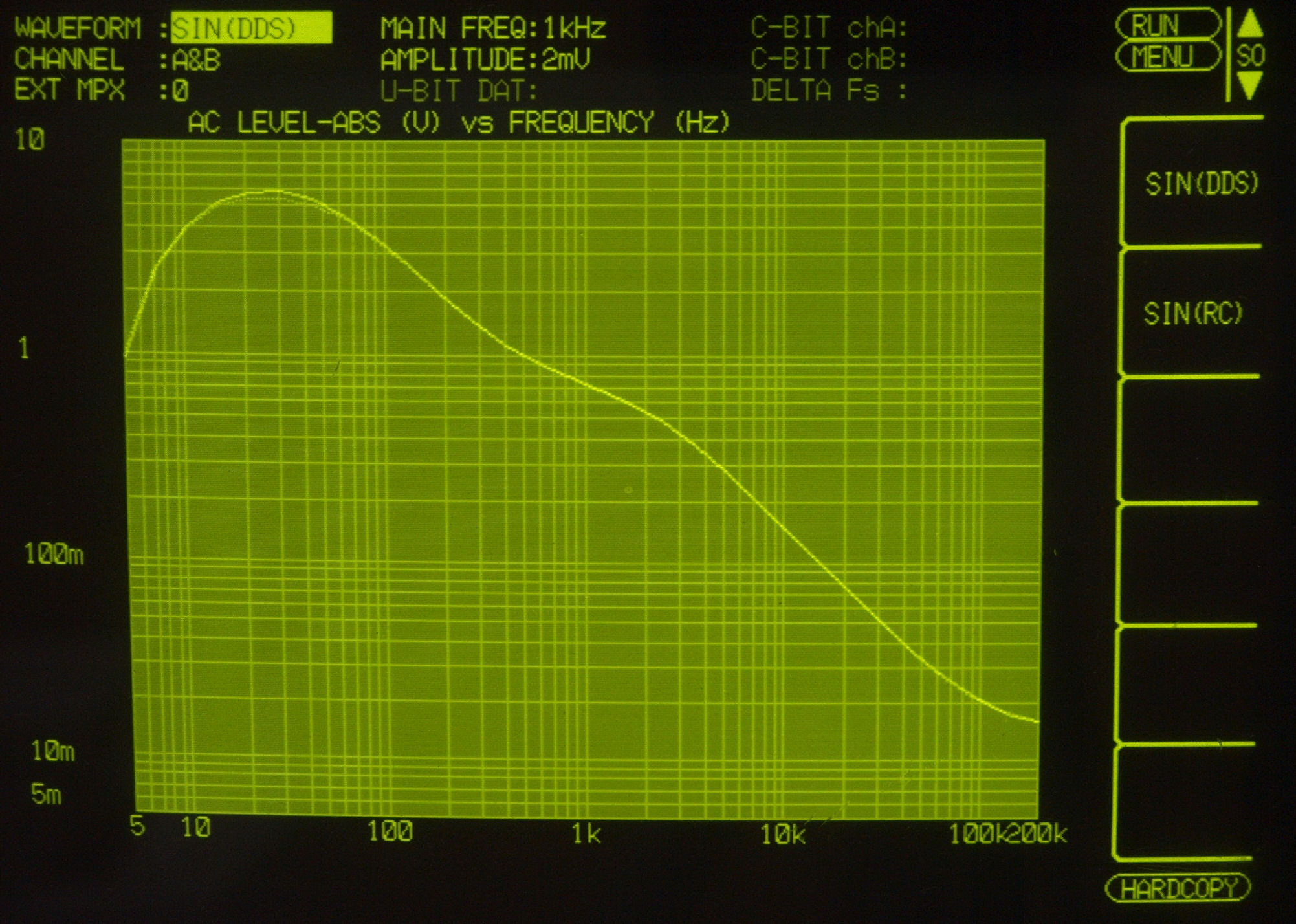 | E32. MM 100Hz入力、R側出力電圧=1V、 0.049%歪み。 L側出力電圧=1V、 0.048%歪み。 「FFT分析」のオシロのカーソル周波数、左=250Hz、右=1kHz。 |