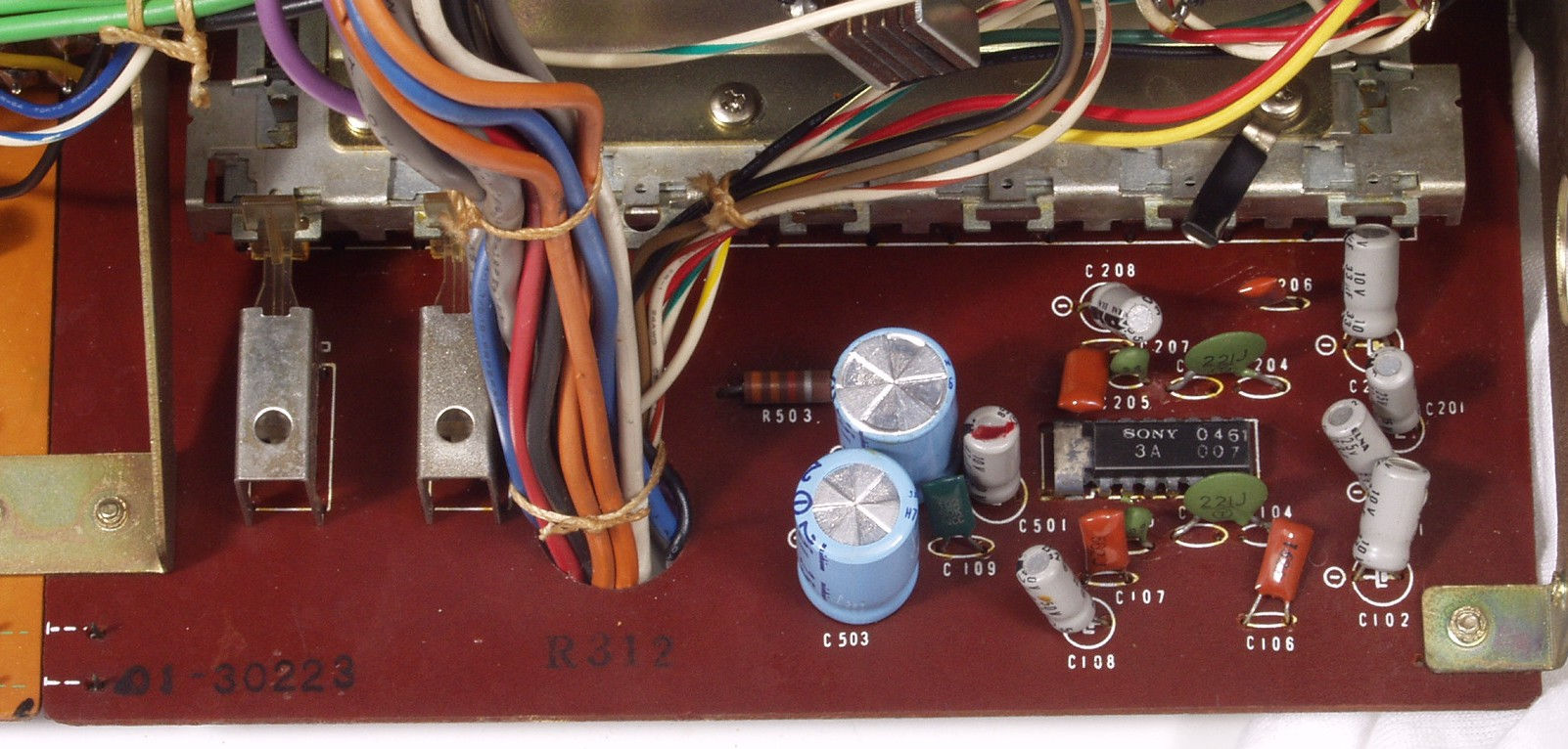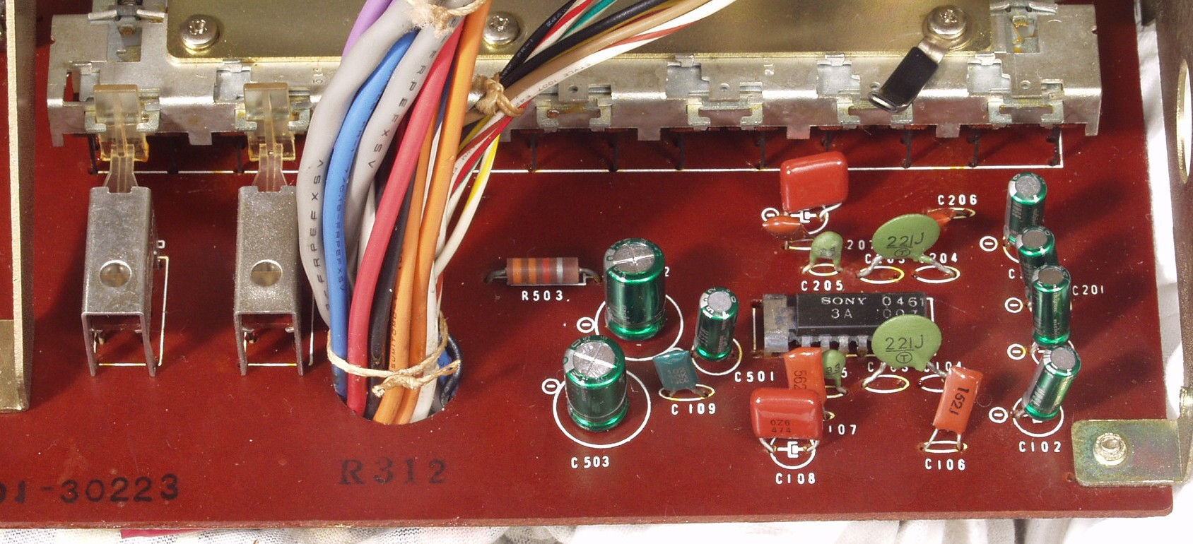 | C2D. 修理後 ドライブ基板。 バイアス調整用半固定2VR、TR(トランジスター)6個、 電解コンデンサー12個、フイルムコンデンサー2個交換。 |