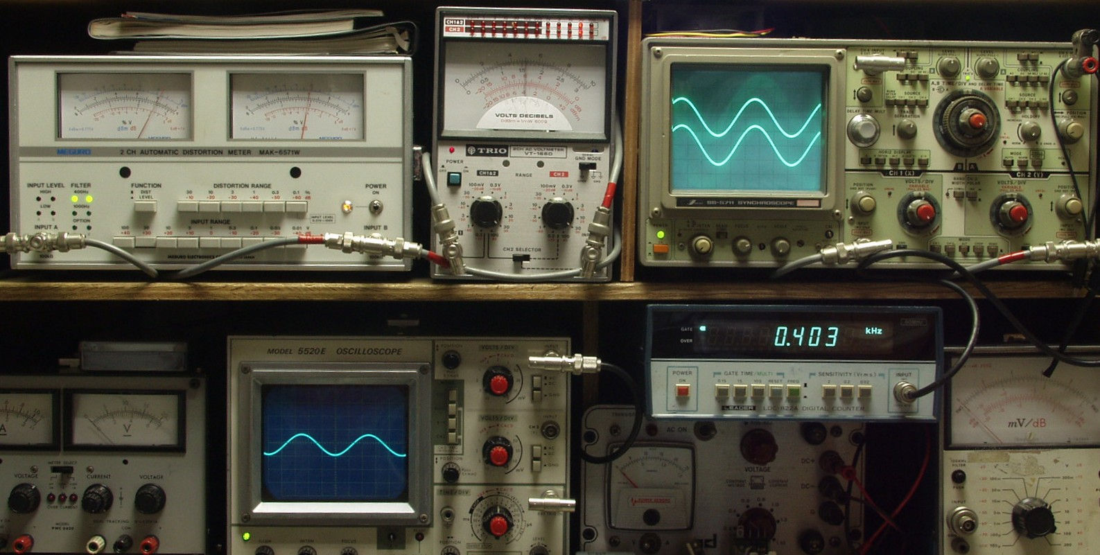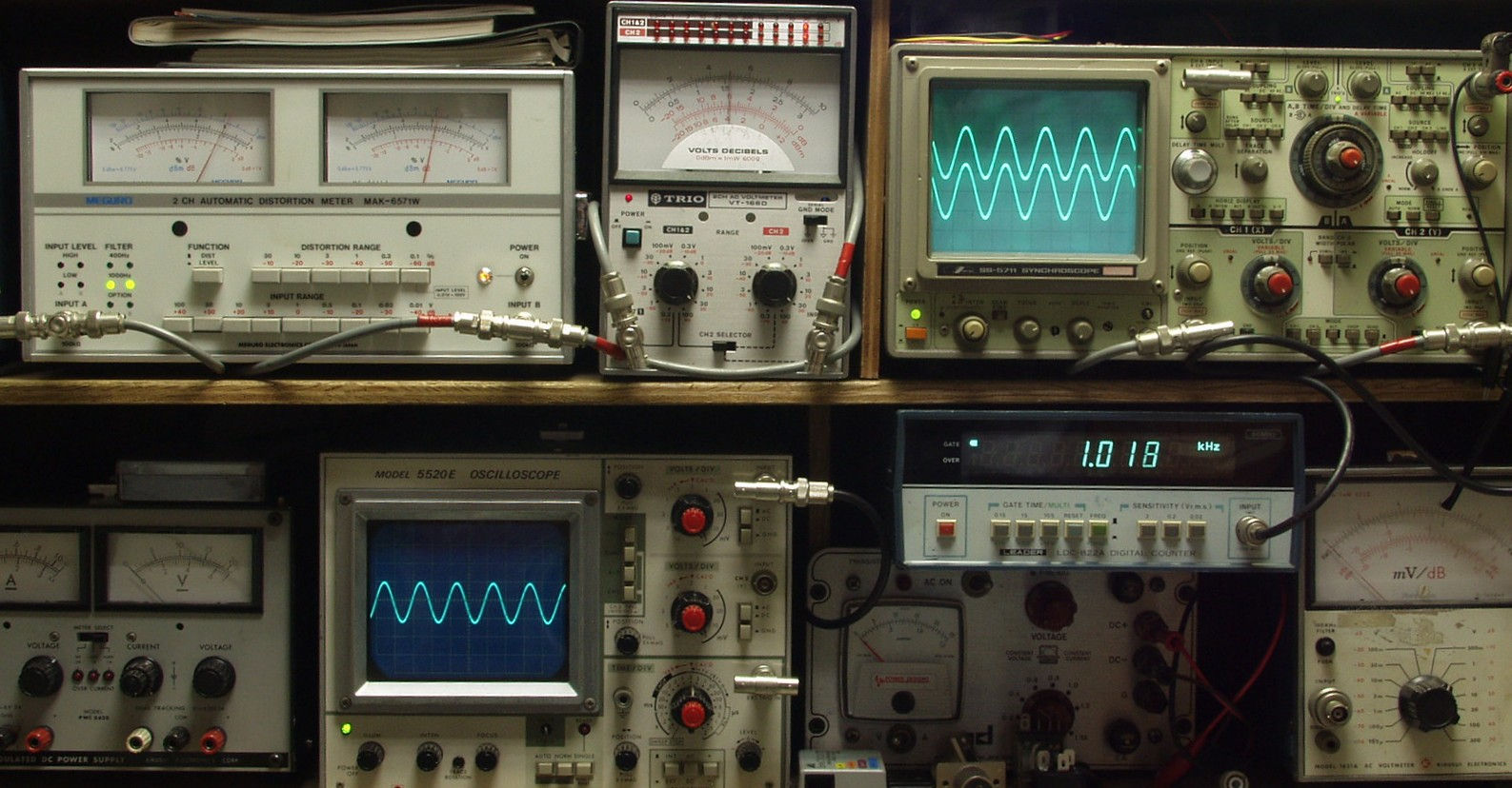 | E. 調整・測定 E1. 出力/歪み率測定・調整 <見方> 上左オーディオ発振器より400HZ・1KHZの信号を出す(歪み率=約0.003%) 下中=入力波形(オーディオ発振器のTTLレベル) 下右=周波数計 上左=SP出力の歪み率測定 左メータ=L出力、右メータ=R出力 上中=SP出力電圧測定器、赤針=R出力、黒針=L出力 上右=SP出力波形オシロ 上=R出力、下=L出力(出力電圧測定器の出力) |