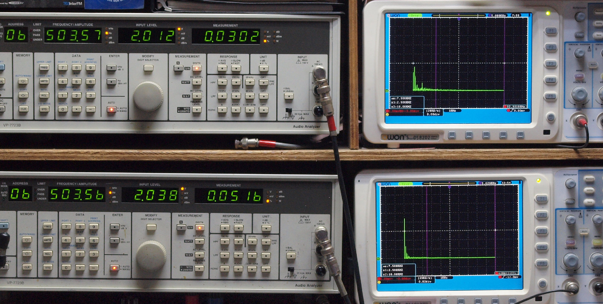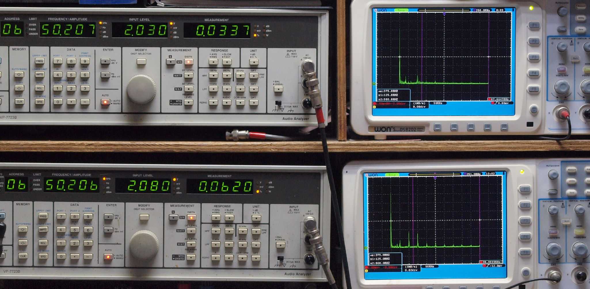 | E. 調整・測定。 画像をクリックすると、大きく(横幅2050ドット)表示されます。 E0. 出力・歪み率測定・調整。 「見方」。 上段中 右側出力を「Audio Analyzer Panasonic VP−7723B」により測定。 表示LED、 左端=メモリーNo、 中左=周波数測定、 中右=出力電圧測定、 右端=歪み率測定。 上段右端 VP−7723Bの基本波除去出力を「owon SDS8202(200MHZ)」で「FFT分析」表示。 下段中 左側出力を「Audio Analyzer Panasonic VP−7723B」により測定。 表示LED、 左端=メモリーNo、 中左=周波数測定、 中右=出力電圧測定、 右端=歪み率測定。 下段右端 VP−7723Bの基本波除去出力を「owon SDS6062(200MHZ)」で「FFT分析」表示。 下段左端 オーディオ発振器 VP−7201A より50Hz〜100kHzの信号を出し(歪み率=約0.003%)、ATT+分配器を通し、AMPに入力。 よって、ダイアル設定出力レベルより低くなります。測定機器の仕様や整備の様子はこちら、「VP−7723B」「VP−7201A」。 FFT画面の見方はこちら。 |