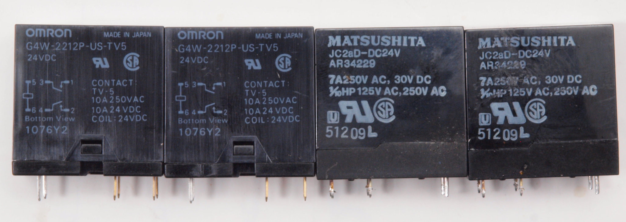 | CL2. 交換部品、SP接続リレー。 右=付いていた接点容量7Aのリレー、8Ω出力だと392W定格。 左=交換する接点容量10Aのリレー、8Ω出力だと800W定格。 |