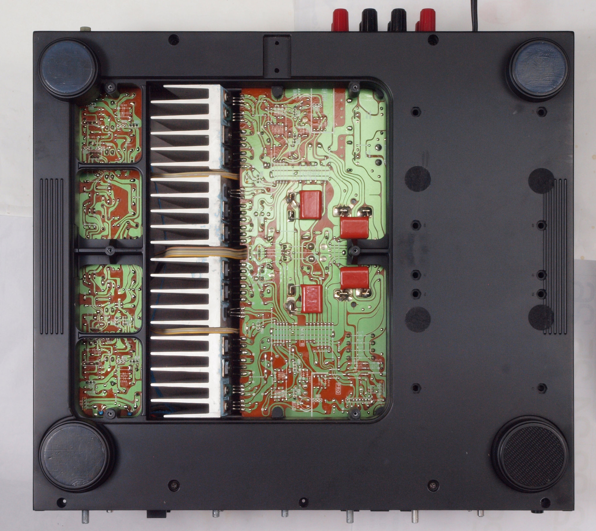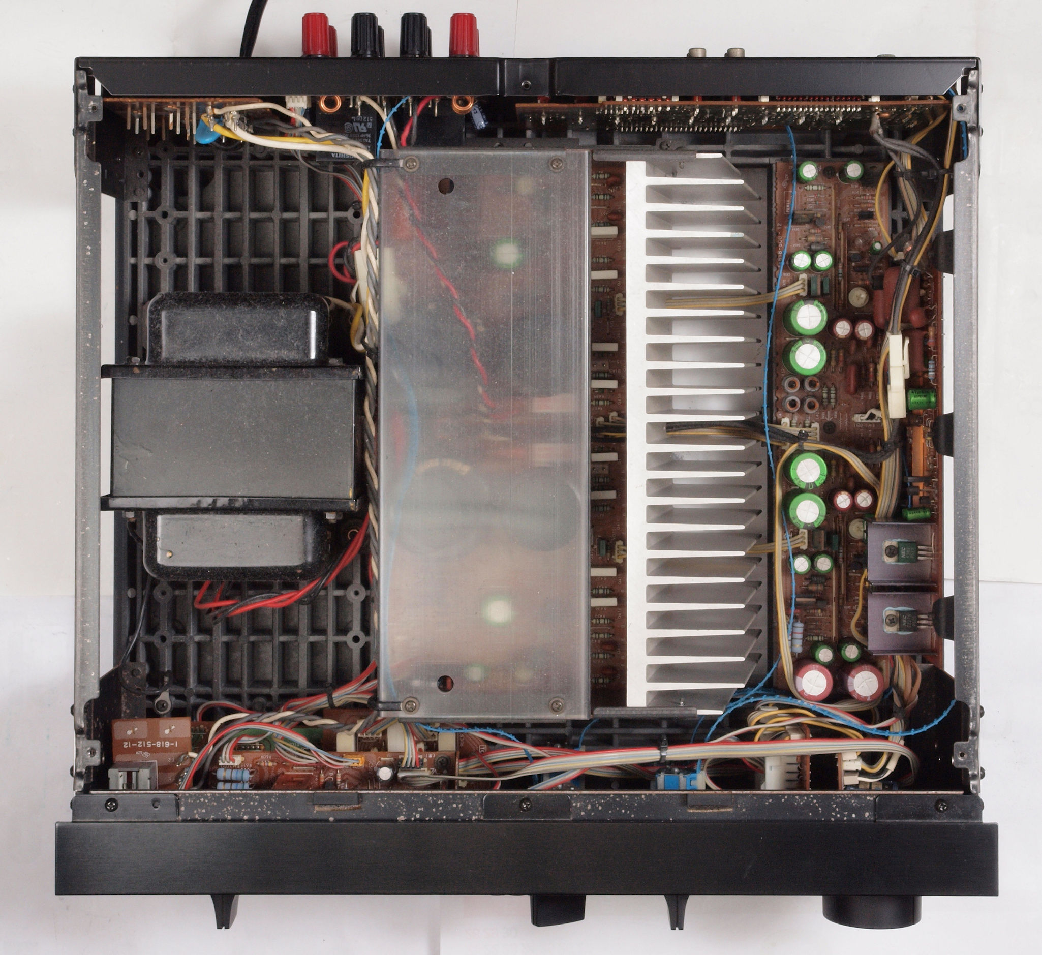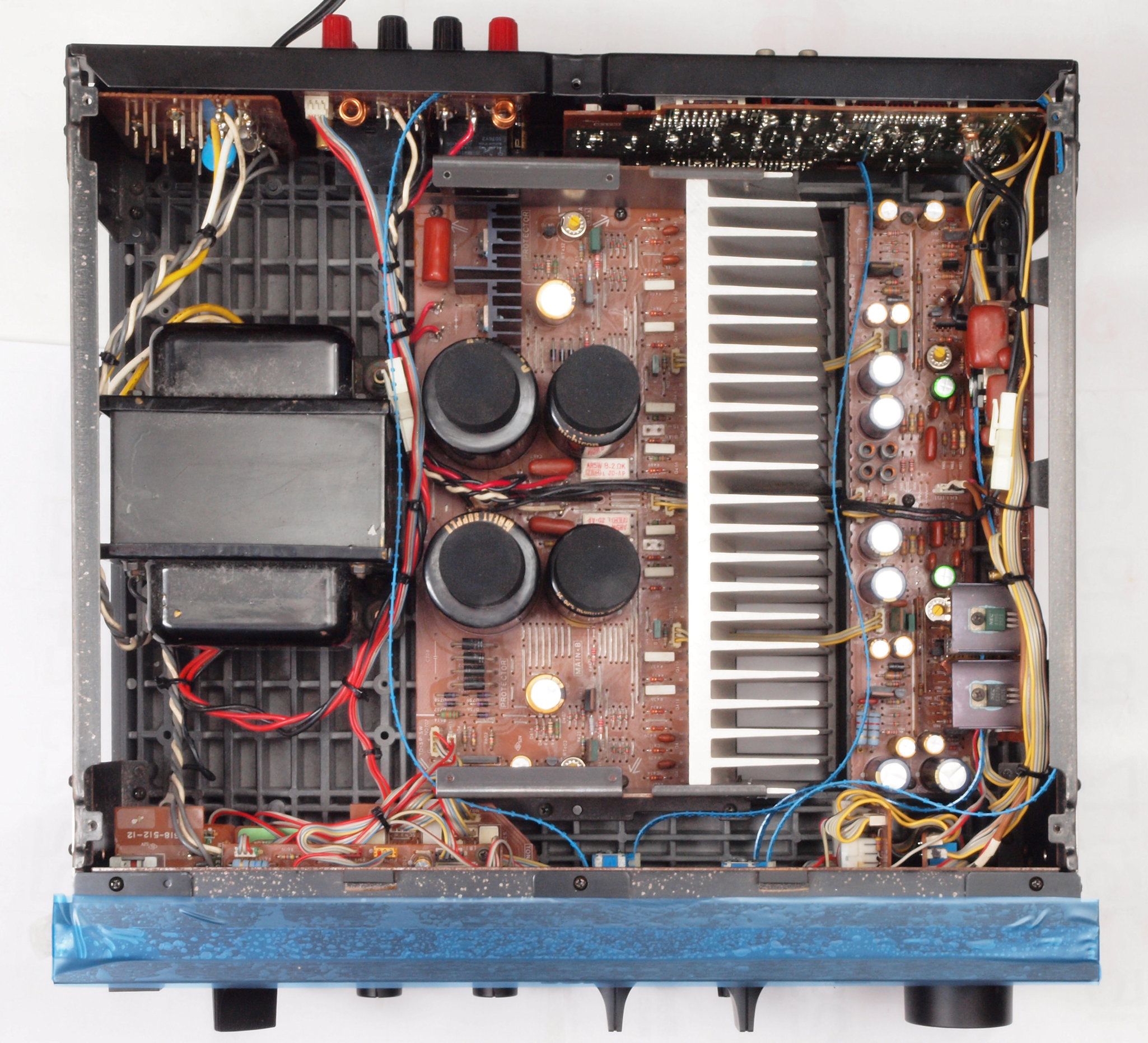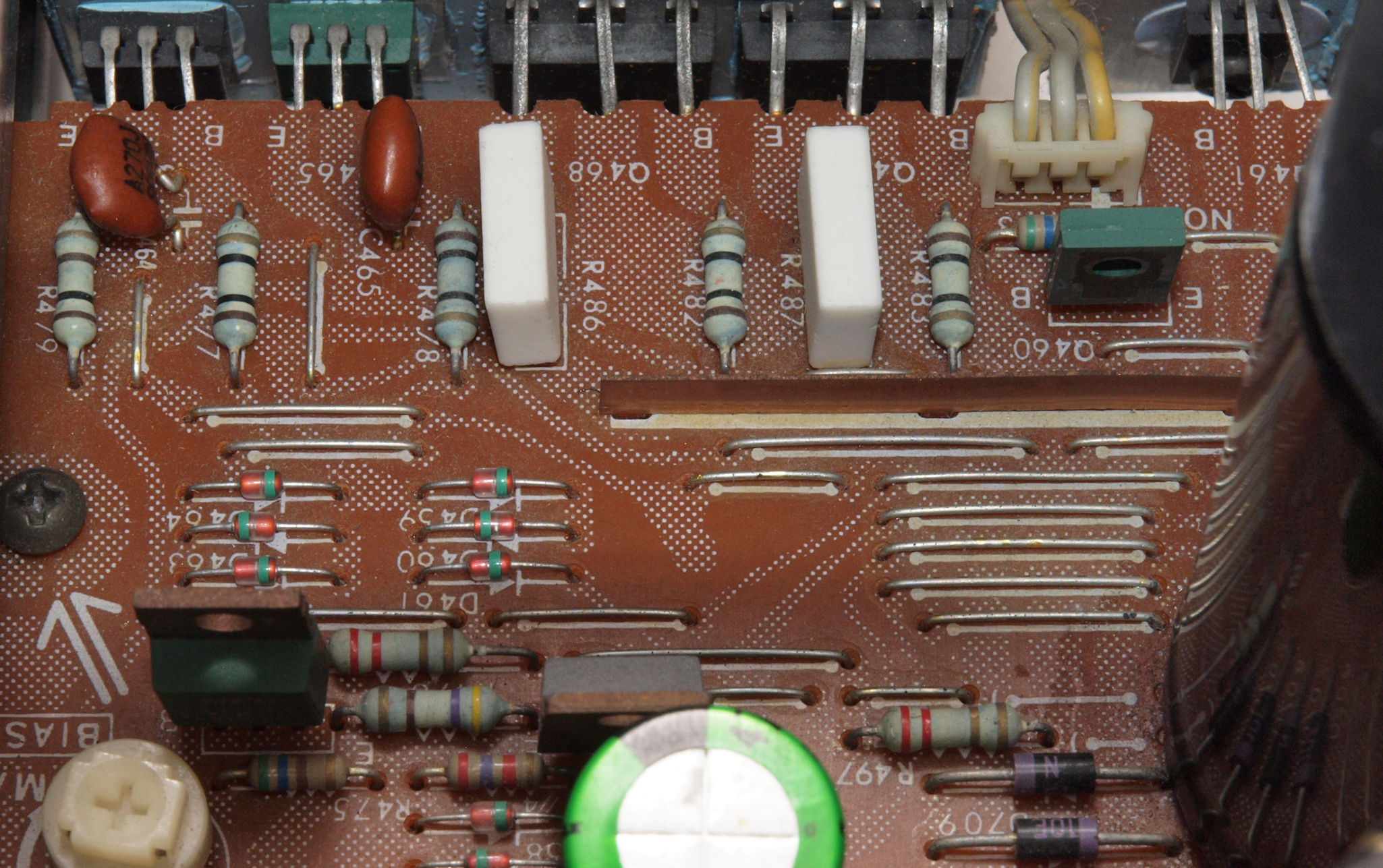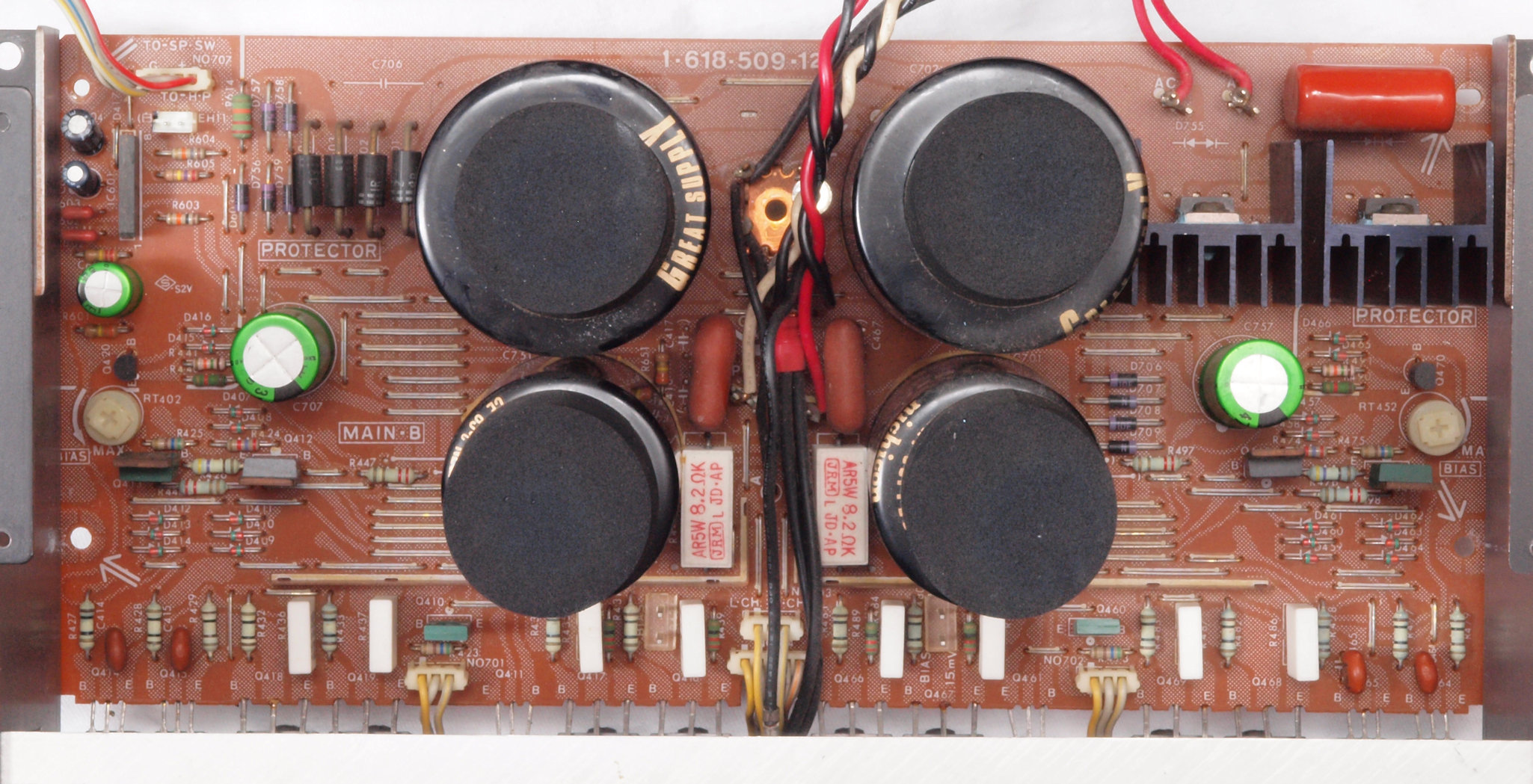 | A18. 点検中 終段AMP基板。 左側ヒューズ入抵抗は全滅。 | ||||||||||||||||||||||||||||||||||||||