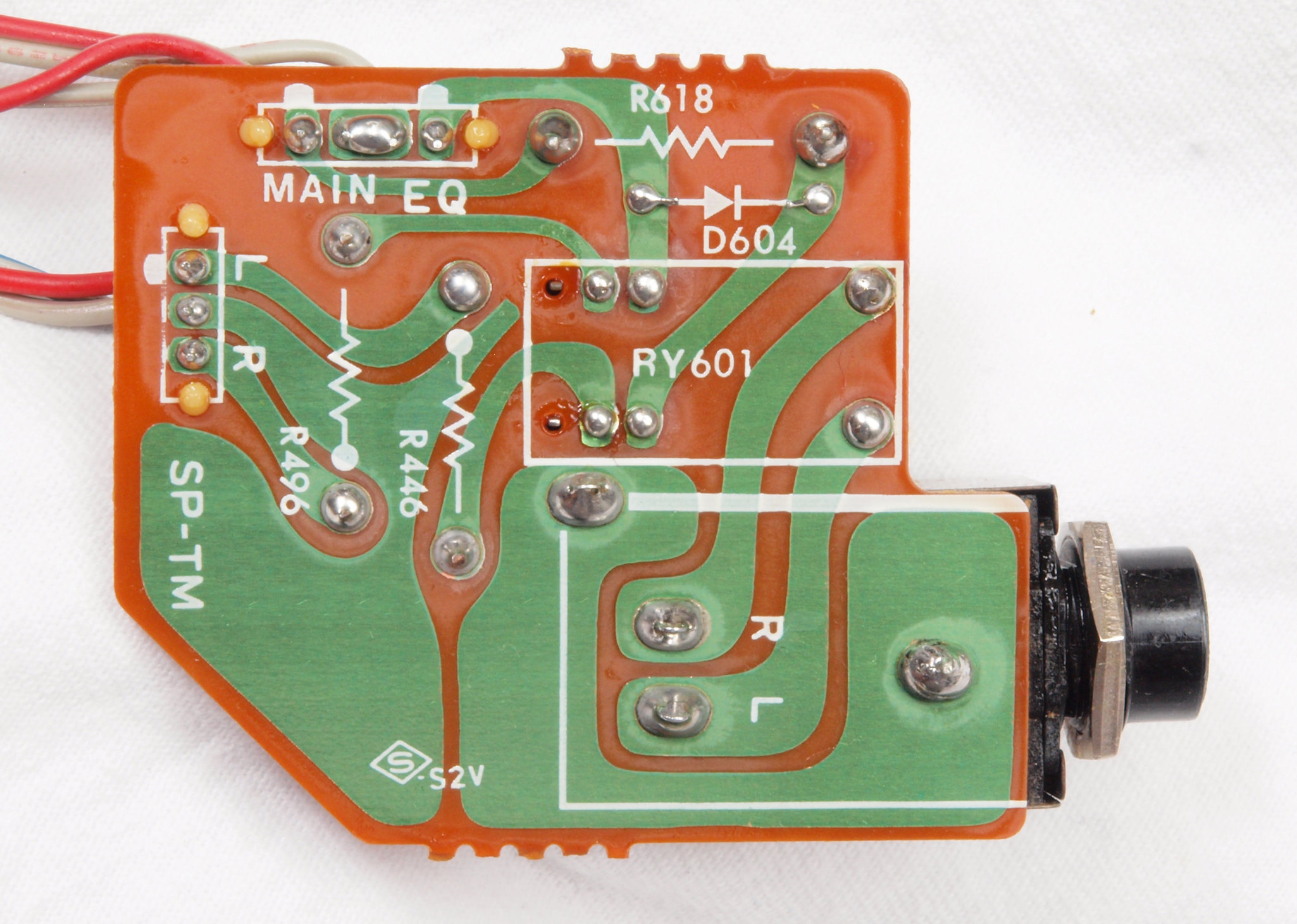 CI2. 修理中 SP出力端子裏 使用済み吸い取り線で補強する。