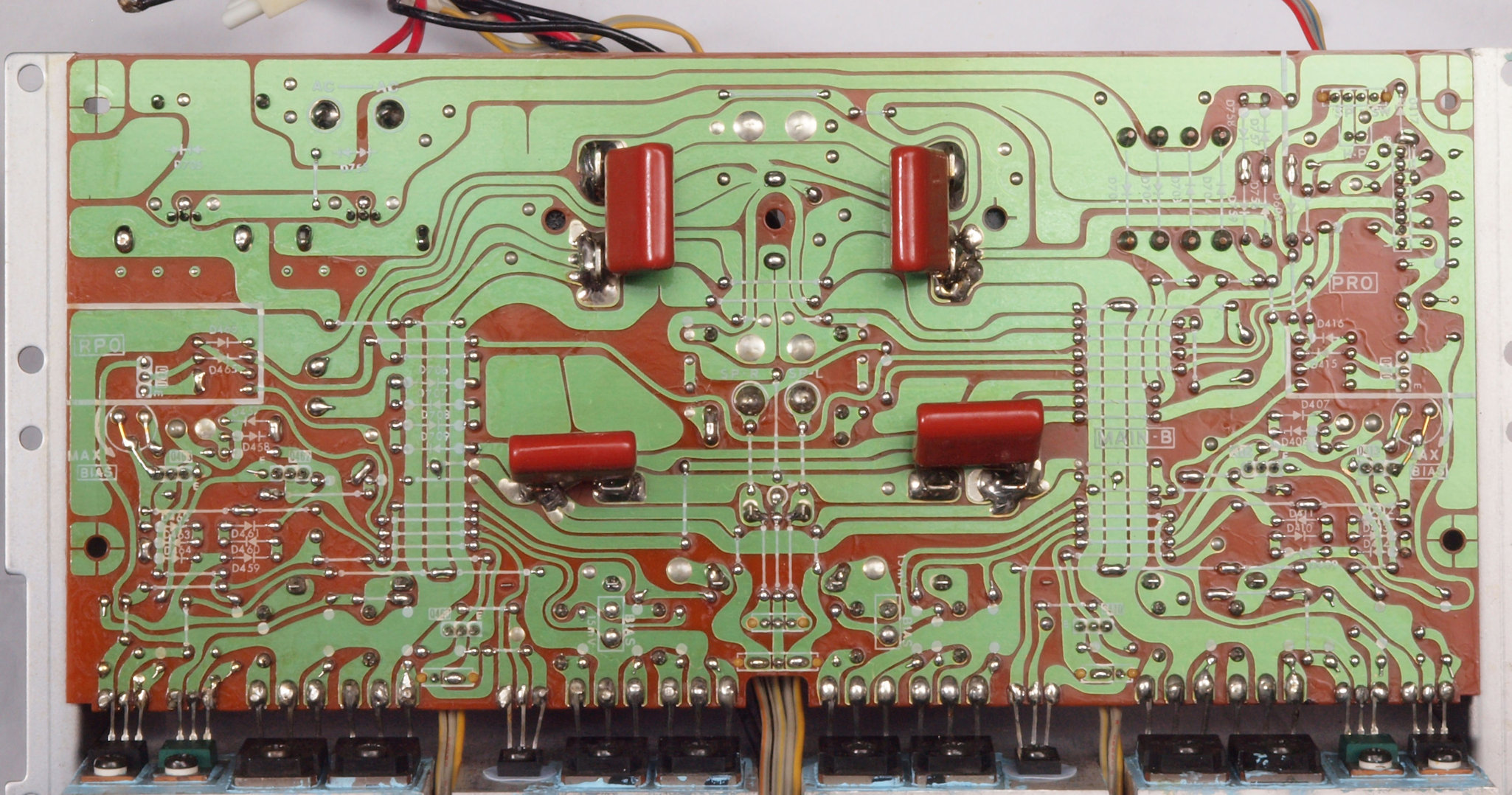 | C22. 修理後 POWER AMP−A基板 複合TR(トランジスター)2個、電解コンデンサ−20個、半固定VR2個、ヒューズ抵抗8個交換。 | ||||||||||||||||||||||||||||||||||||||