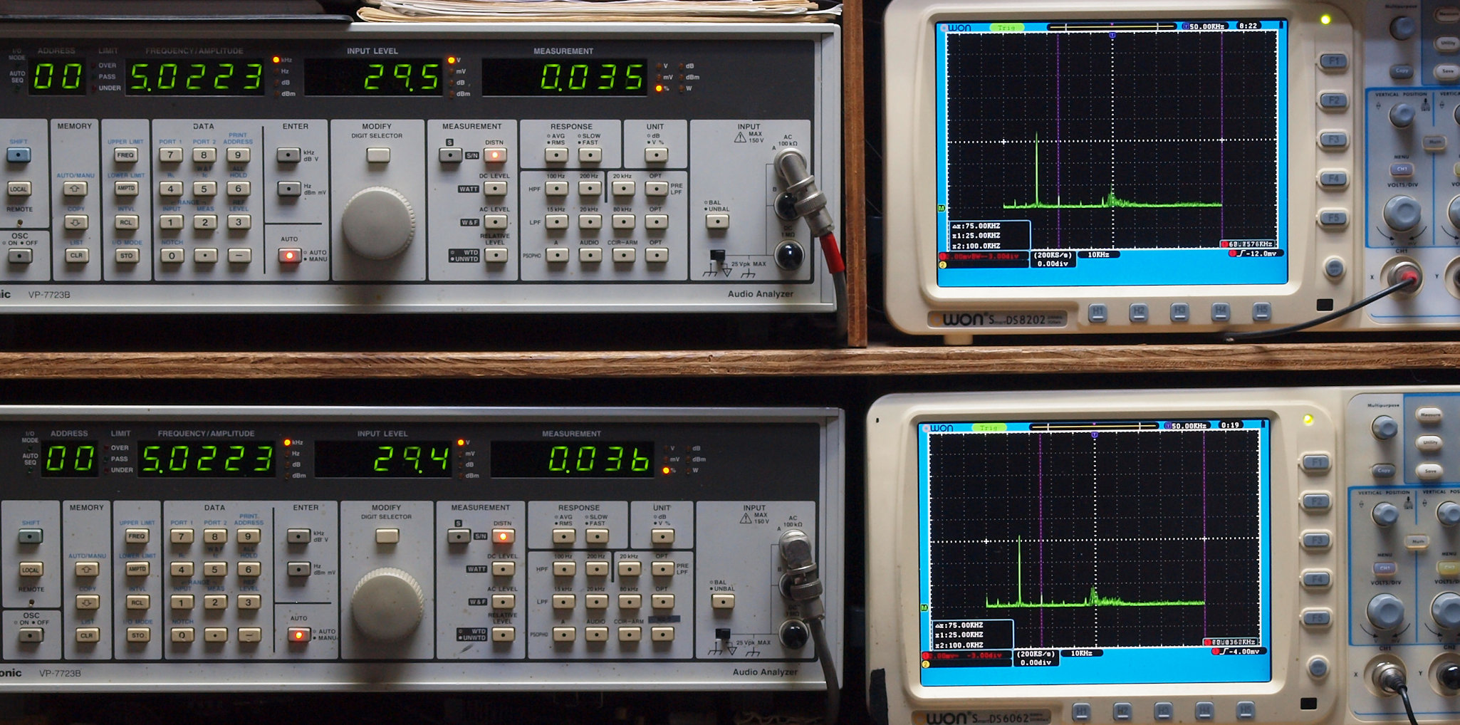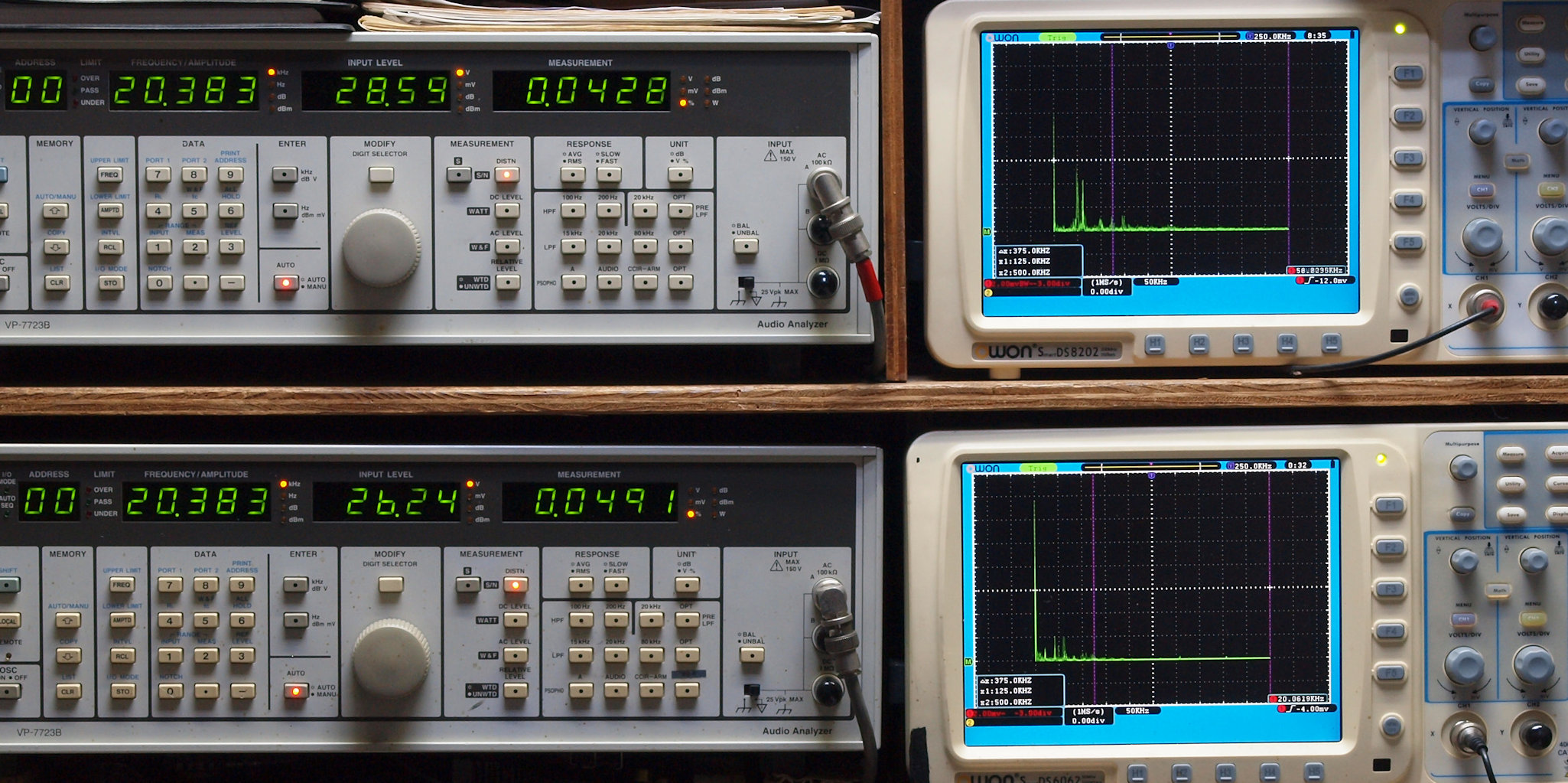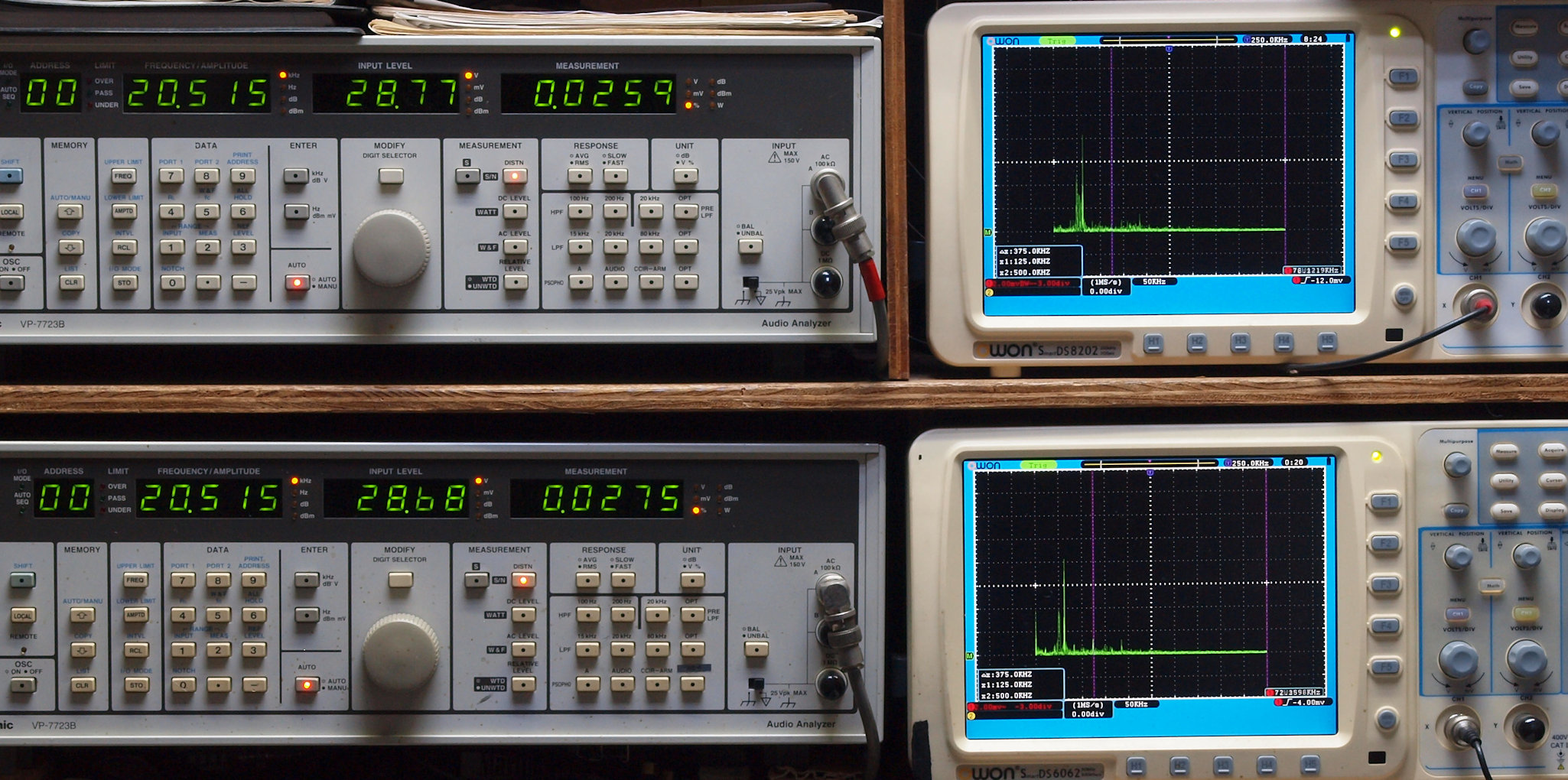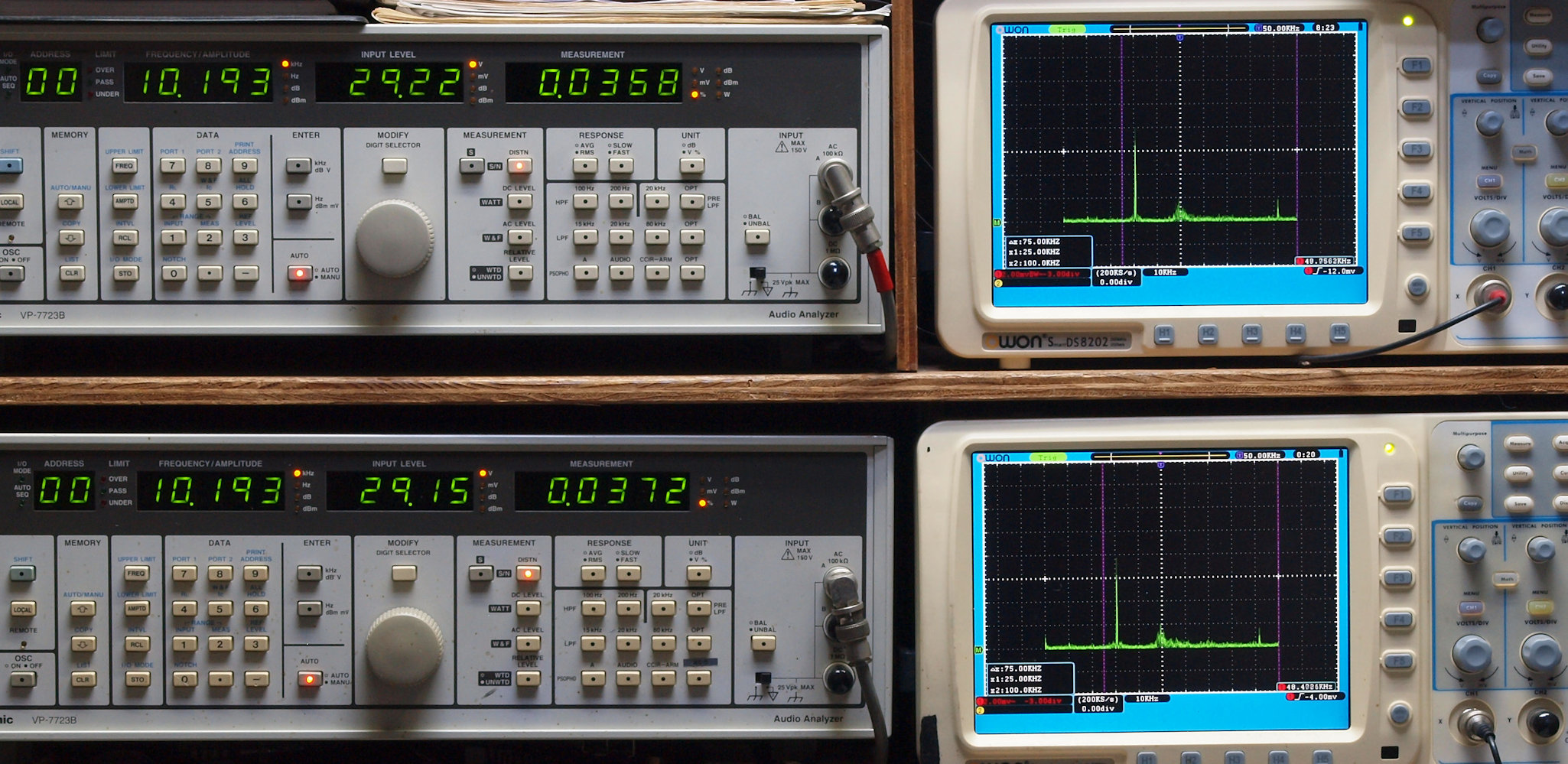 よって、ダイアル設定出力レベルより低くなります。測定機器の仕様や整備の様子はこちら、「VP−7723B」「VP−7201A」。 FFT画面の見方はこちら。