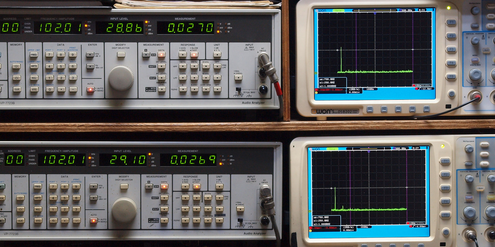 | E. 調整・測定。 画像をクリックすると、大きく(横幅2050ドット)表示されます。 E0. 出力・歪み率測定・調整、「電源電圧は50HZ 100V」。 「見方」。 上段中 右側出力を「Audio Analyzer Panasonic VP−7723B」により測定。 表示LED、 左端=メモリーNo、 中左=周波数測定、 中右=出力電圧測定、 右端=歪み率測定。 上段右端 VP−7723Bの基本波除去出力を「owon SDS8202(200MHZ)」で「FFT分析」表示。 下段中 左側出力を「Audio Analyzer Panasonic VP−7723B」により測定。 表示LED、 左端=メモリーNo、 中左=周波数測定、 中右=出力電圧測定、 右端=歪み率測定。 下段右端 VP−7723Bの基本波除去出力を「owon SDS6062(200MHZ)」で「FFT分析」表示。 下段左端 オーディオ発振器 VP−7201A より50Hz〜100kHzの信号を出し(歪み率=約0.003%)、ATT+分配器を通し、AMPに入力。 よって、ダイアル設定出力レベルより低くなります。測定機器の仕様や整備の様子はこちら、「VP−7723B」「VP−7201A」。 FFT画面の見方はこちら。 |