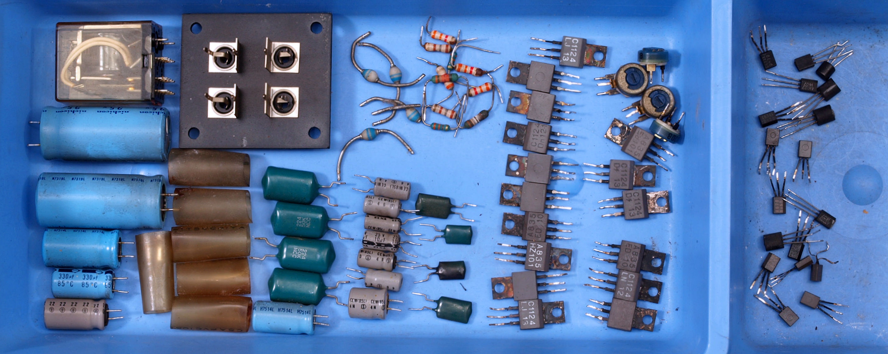 | C312. 修理中 入力アンプ・定電圧基板、 接着材で抵抗・TR(トランジスター)の端子が腐食しているので交換する。 | ||||||||||||||||||||||||||||