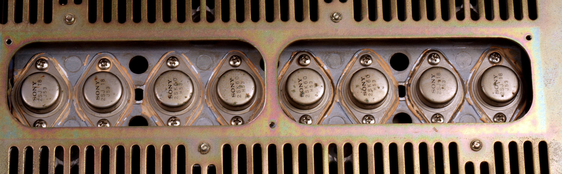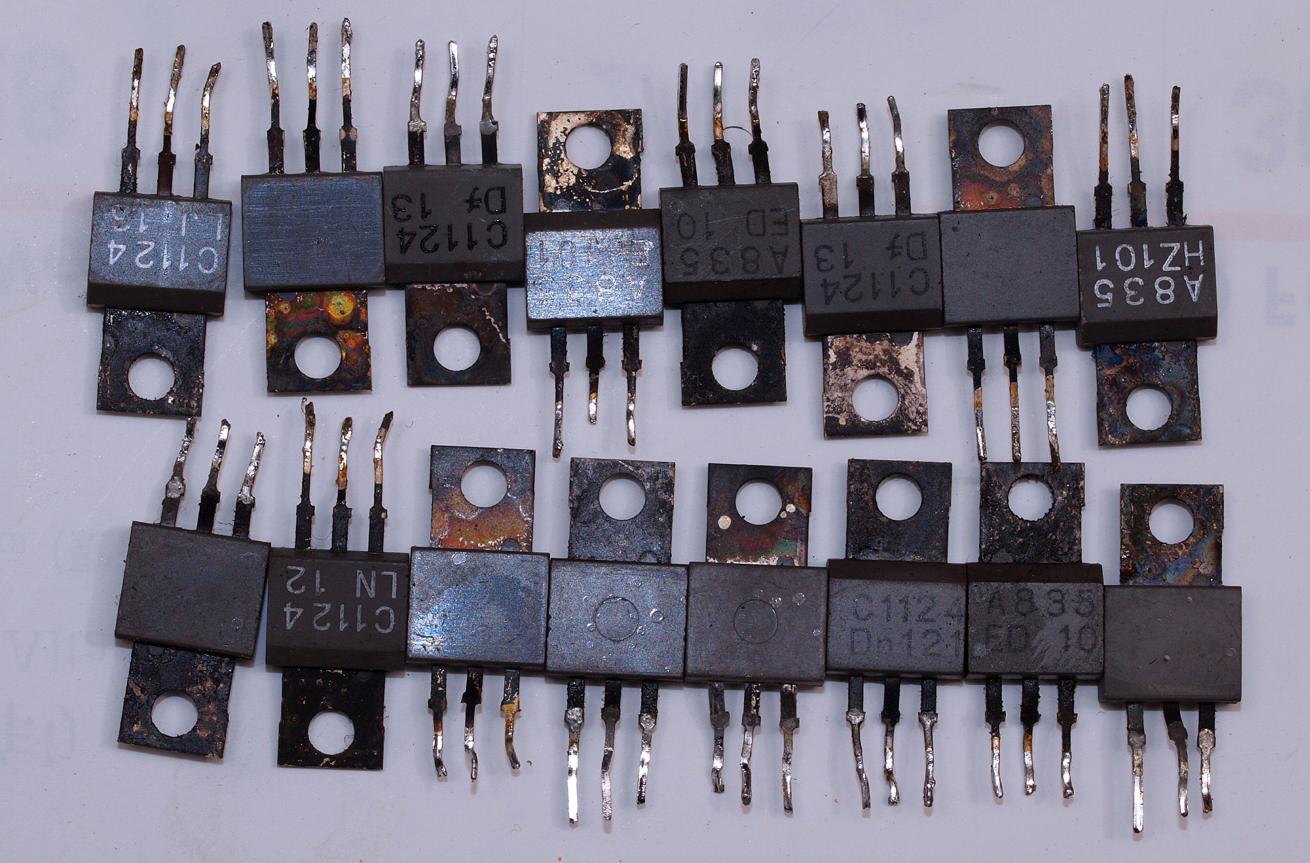 | C11. 修理前 終段V-FET(電解トランジスター)、 3個が短絡焼損。 | ||||||||||||||||||||||||||||