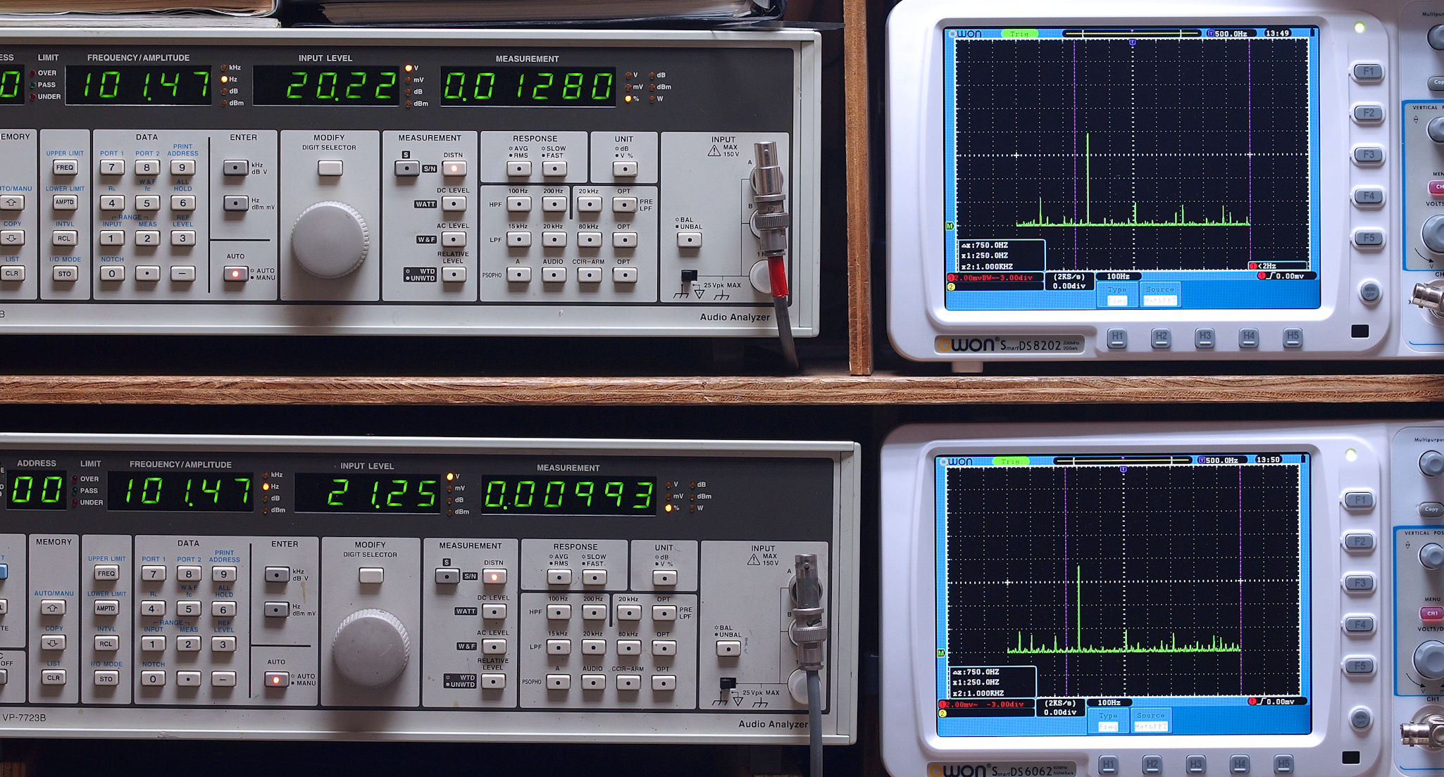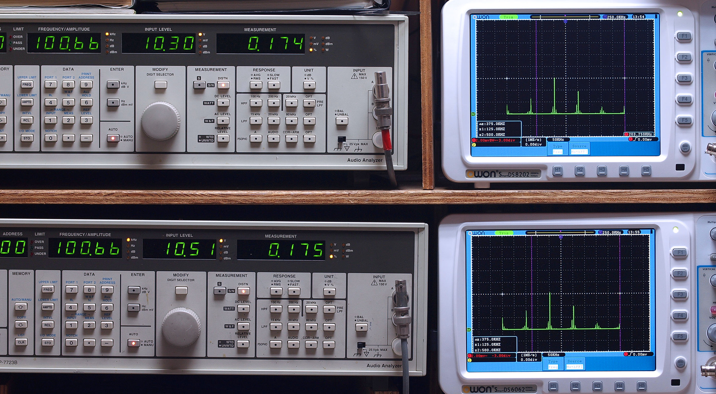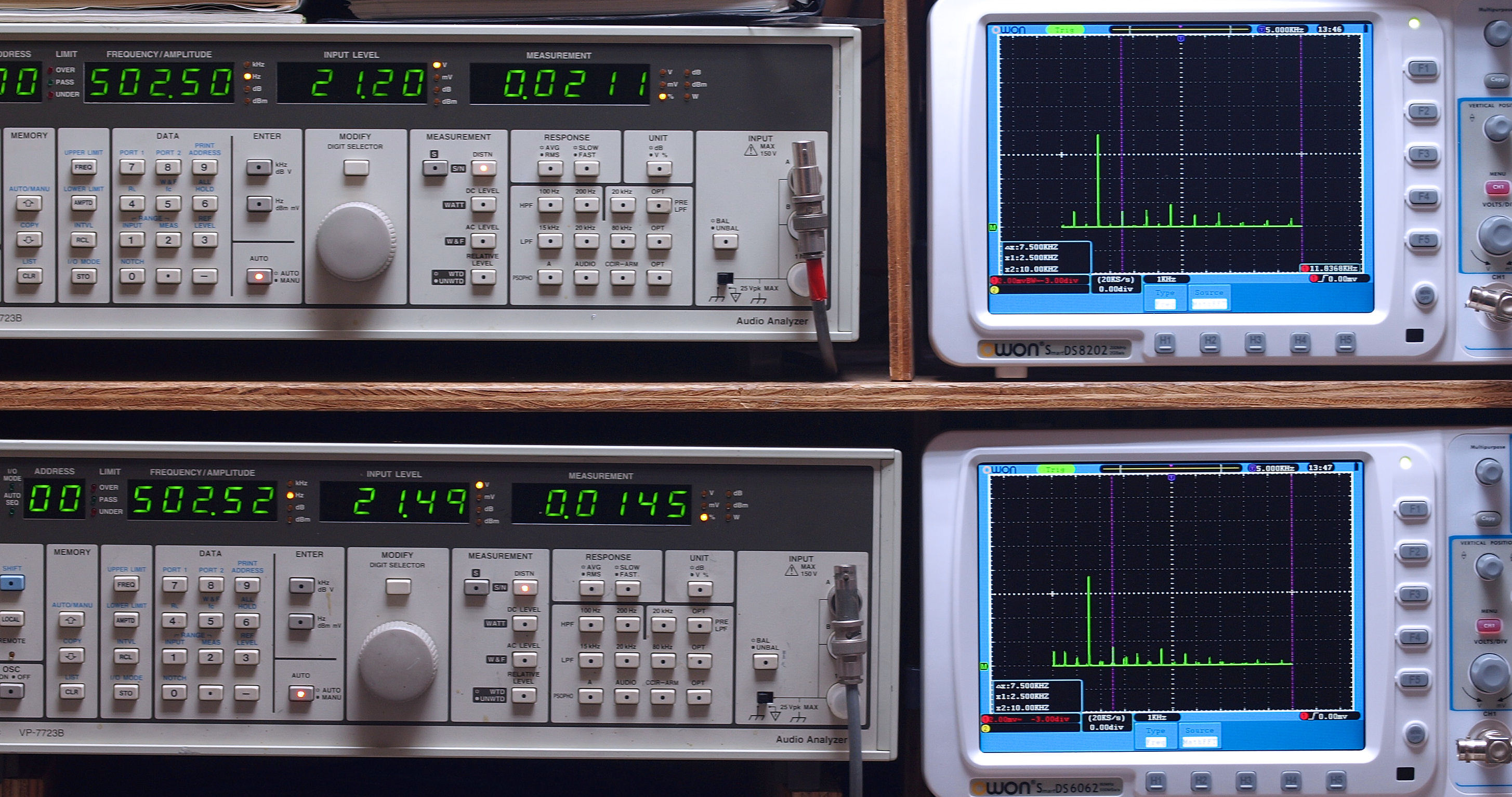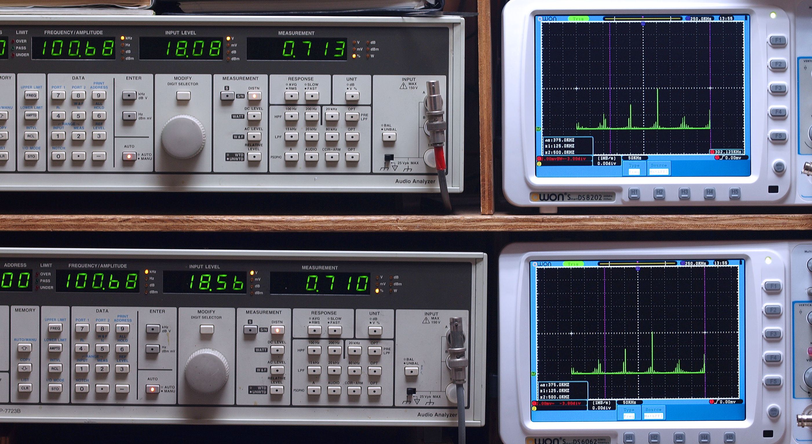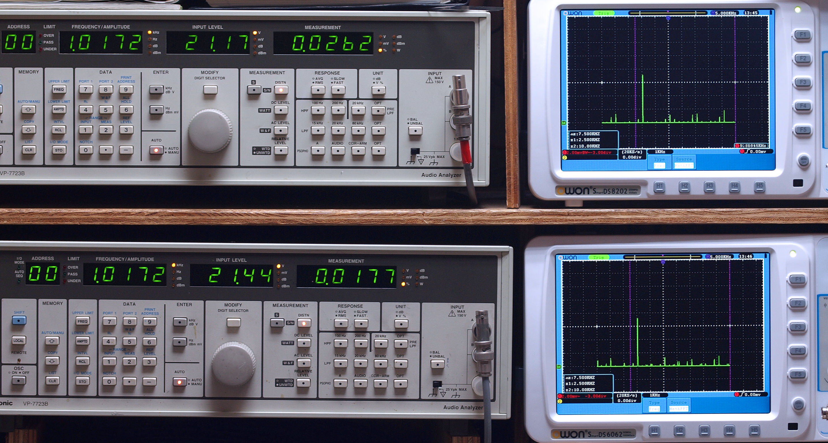 | E. 調整・測定。 E1. 出力・歪み率測定・調整。 「見方」。 上段中 右側SP出力を「Audio Analyzer Panasonic VP−7723B」により測定。 表示LED、 左端=メモリーNo、 中左=周波数測定、 中右=出力電圧測定、 右端=歪み率測定。 上段右端 VP−7723Bの基本波除去出力を「owon SDS8202(200MHZ)」で「FFT分析」表示。 下段中 左側SP出力を「Audio Analyzer Panasonic VP−7723B」により測定。 表示LED、 左端=メモリーNo、 中左=周波数測定、 中右=出力電圧測定、 右端=歪み率測定。 下段右端 VP−7723Bの基本波除去出力を「owon SDS6062(200MHZ)」で「FFT分析」表示。 下段左端 オーディオ発振器 VP−7201A より50Hz〜100kHzの信号を出し(歪み率=約0.003%)、ATT+分配器を通し、AMPに入力。 よって、ダイアル設定出力レベルより低くなります。測定機器の仕様や整備の様子はこちら、「VP−7723B」「VP−7201A」。 FFT画面の見方はこちら。 |