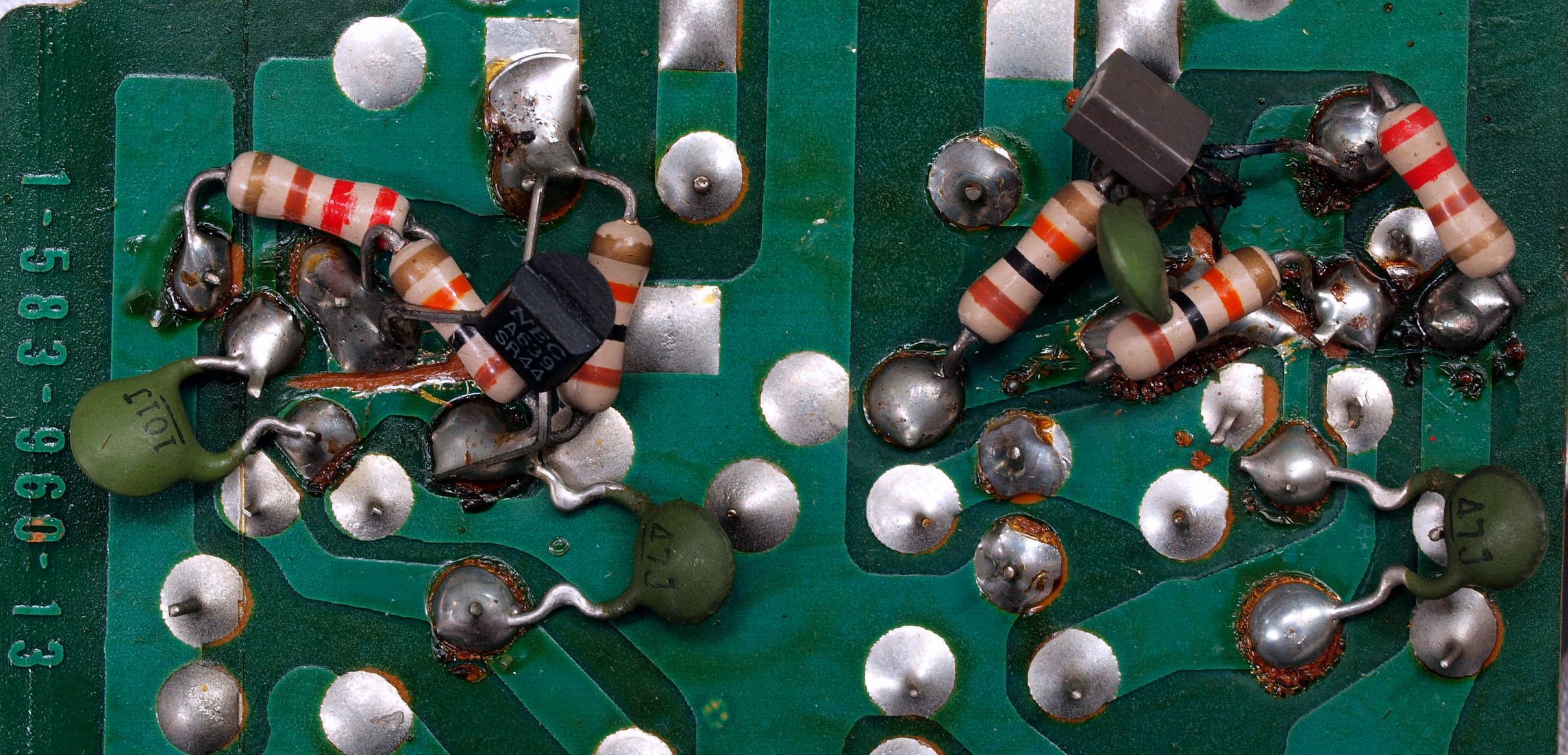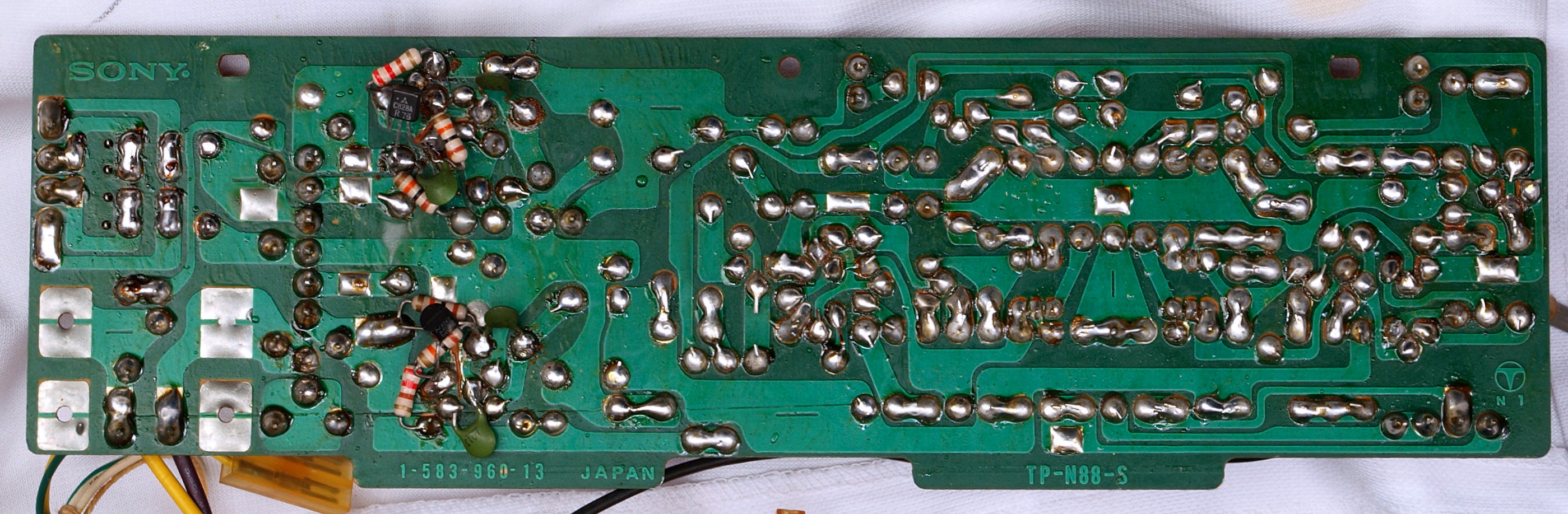 | C332. 修理前 入力アンプ・定電圧基板裏、設計変更による現場での補修作業。 | ||||||||||||||||||||||||||||