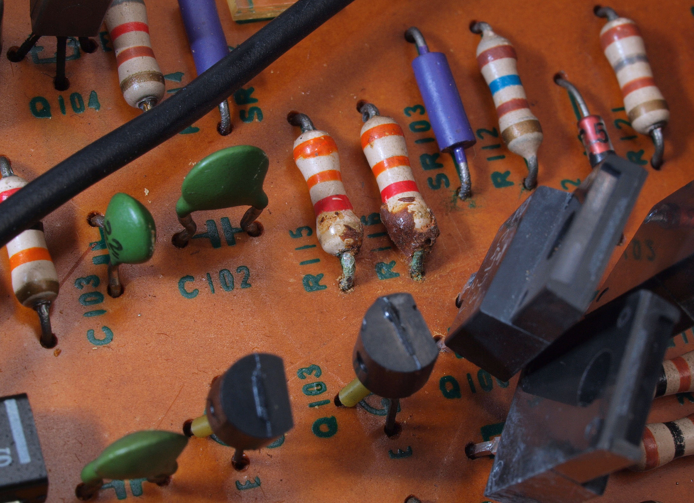 | C313. 修理中 入力アンプ・定電圧基板、 接着材で抵抗・TR(トランジスター)の端子が腐食しているので交換する。 | ||||||||||||||||||||||||||||