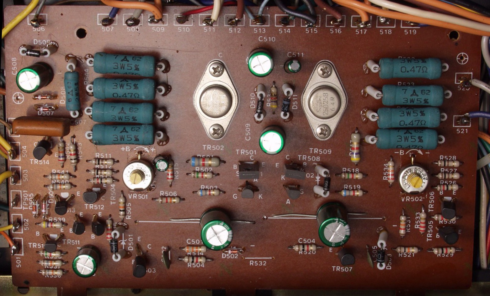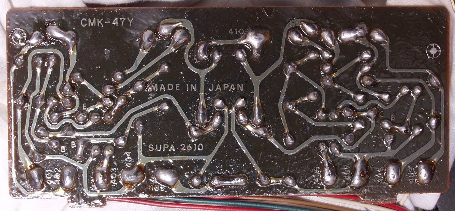 | 寸評 終段TR(トランジスター)の供給電圧まで安定化した理想的なAMPです。 途中で基盤改造がありますので、未対策器は修理した方が良いです(対作品は「2a」のシールが添付) 高域の発振対策を施し、安全の為、フューズを挿入した |