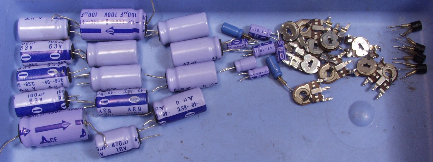 | C1B. 修理後 Rドライブ基板 初段TR(トランジスター)2個、バランス/バイアス調整用半固定VR2個、 電解コンデンサー7個交換 |