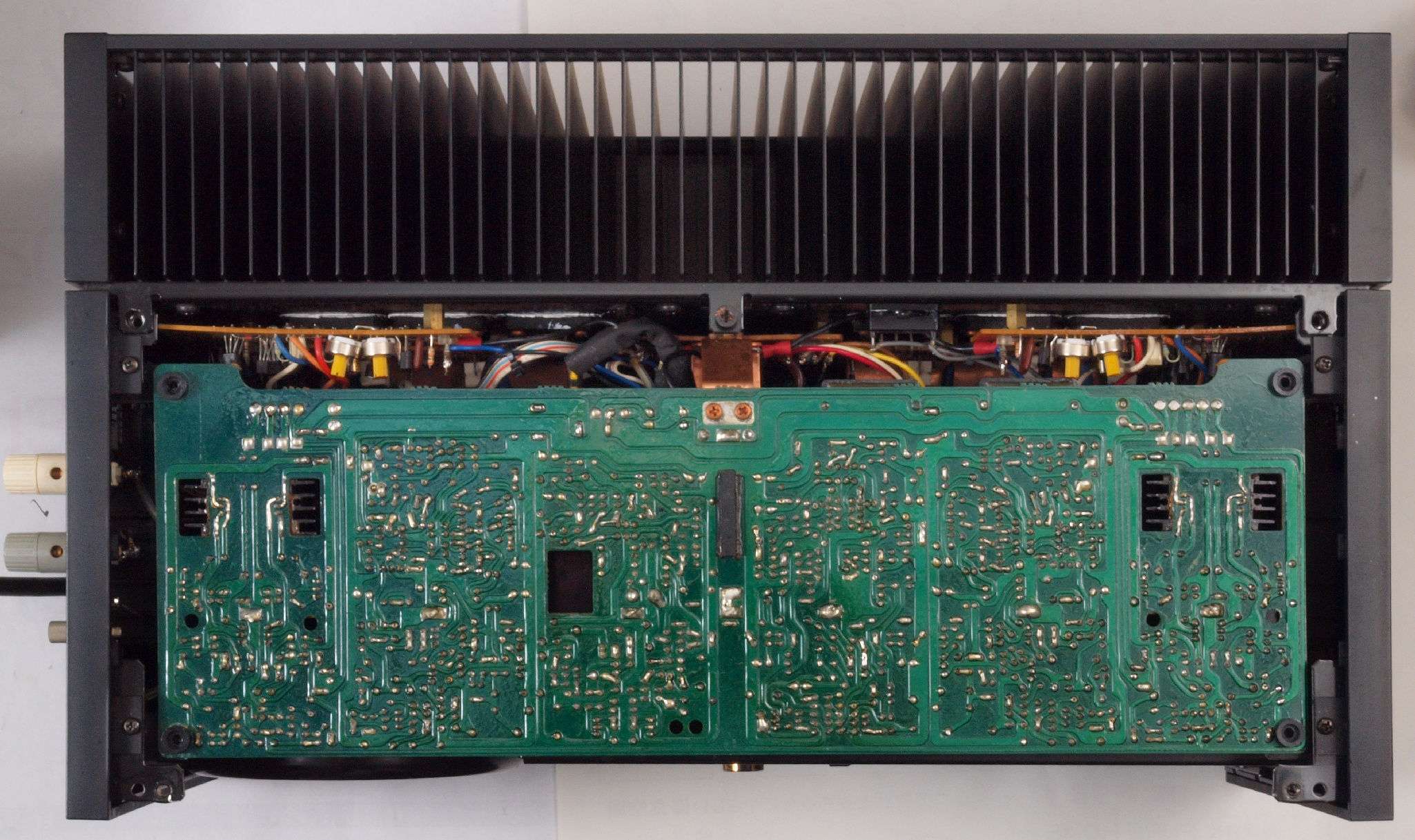| A16. 点検中 上パネルを取り、上から見る。 基板が逆さに取り付けられ、ゴミ等の混入に備え、バッファー・ドライブ基板を絶縁紙が覆う。 お陰で、放熱が悪く、部品の劣化が早い(基本設計が悪い)。 |