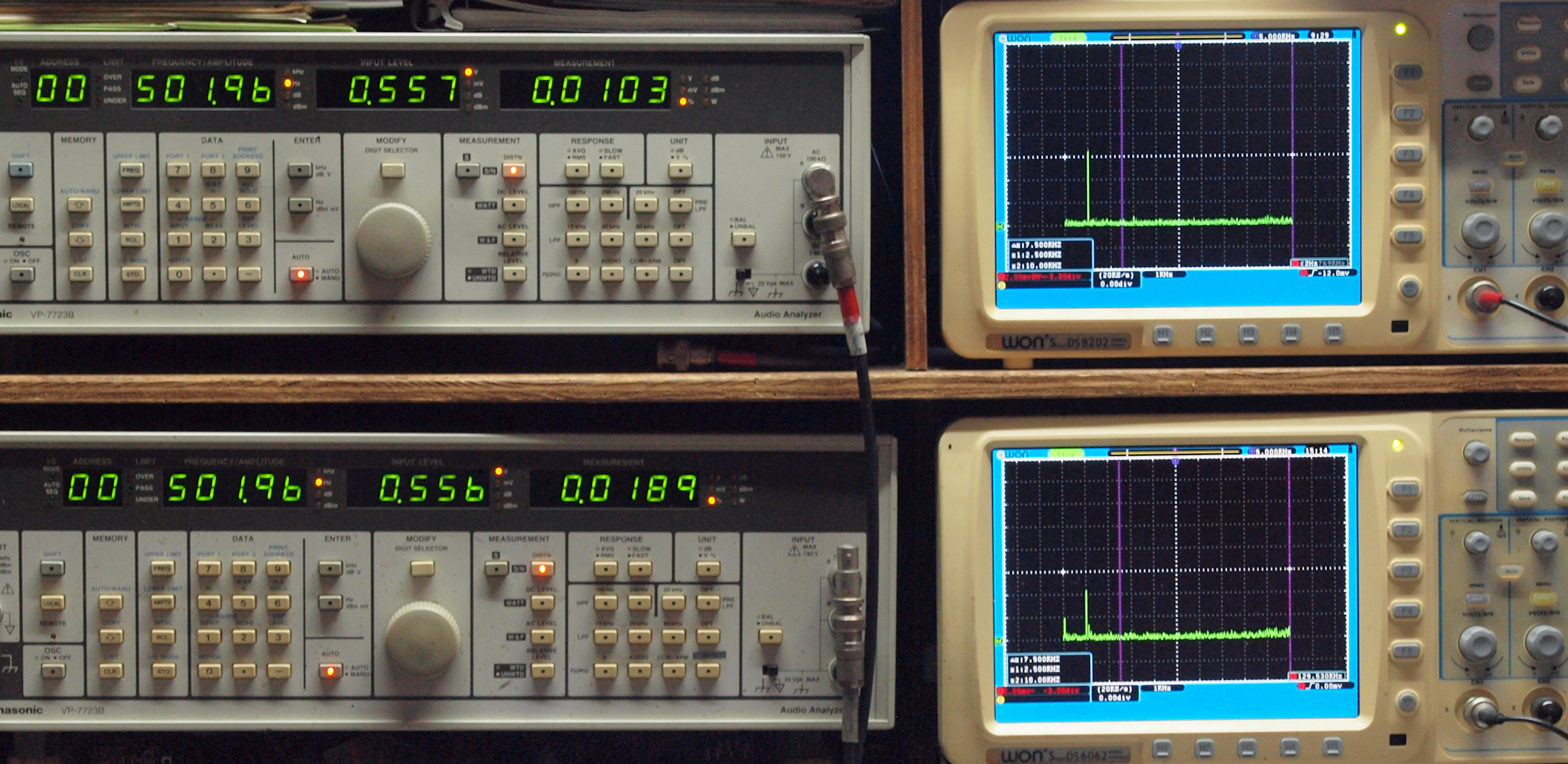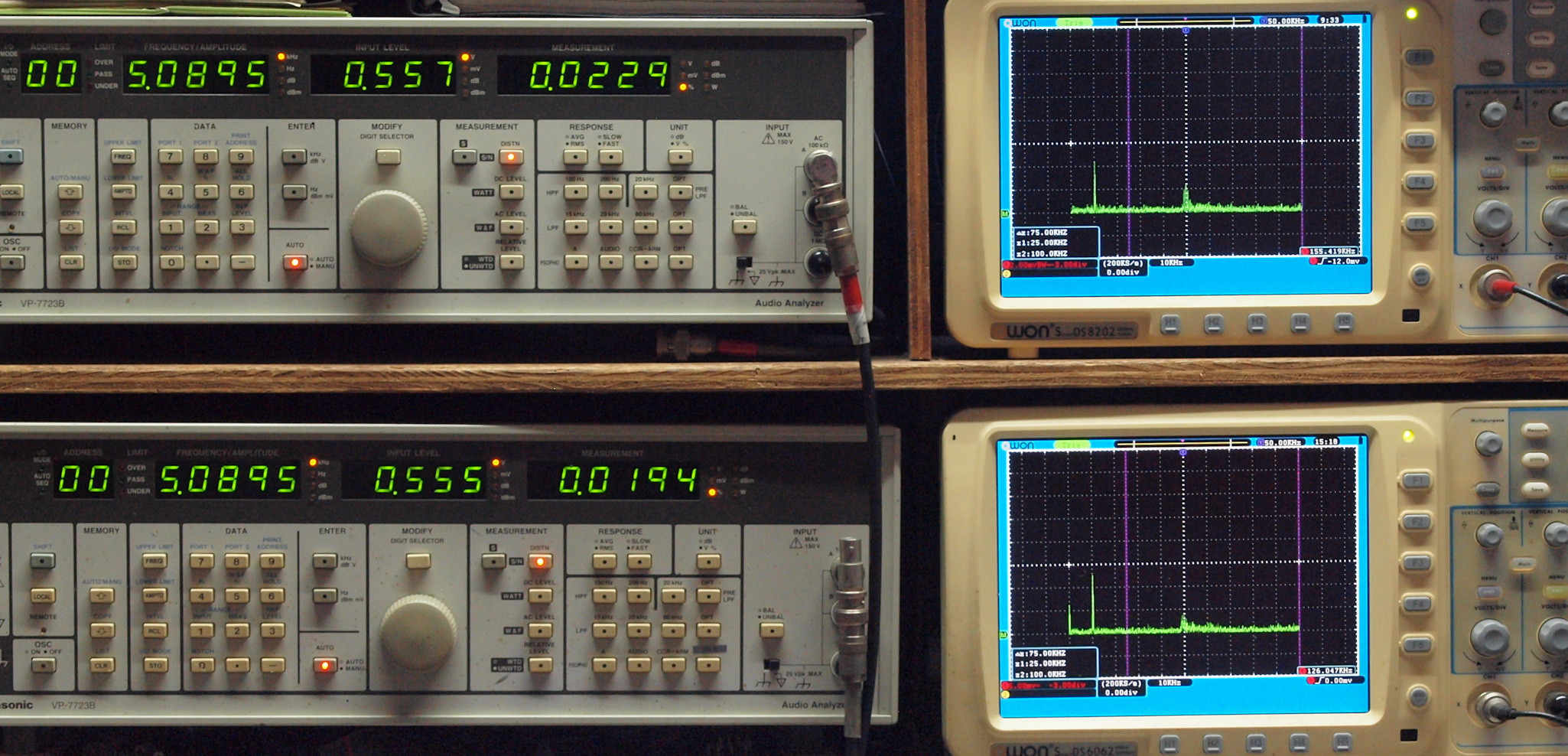 上段右端 VP−7723Bの基本波除去出力を「owon SDS8202(200MHZ)」で「FFT分析」表示。