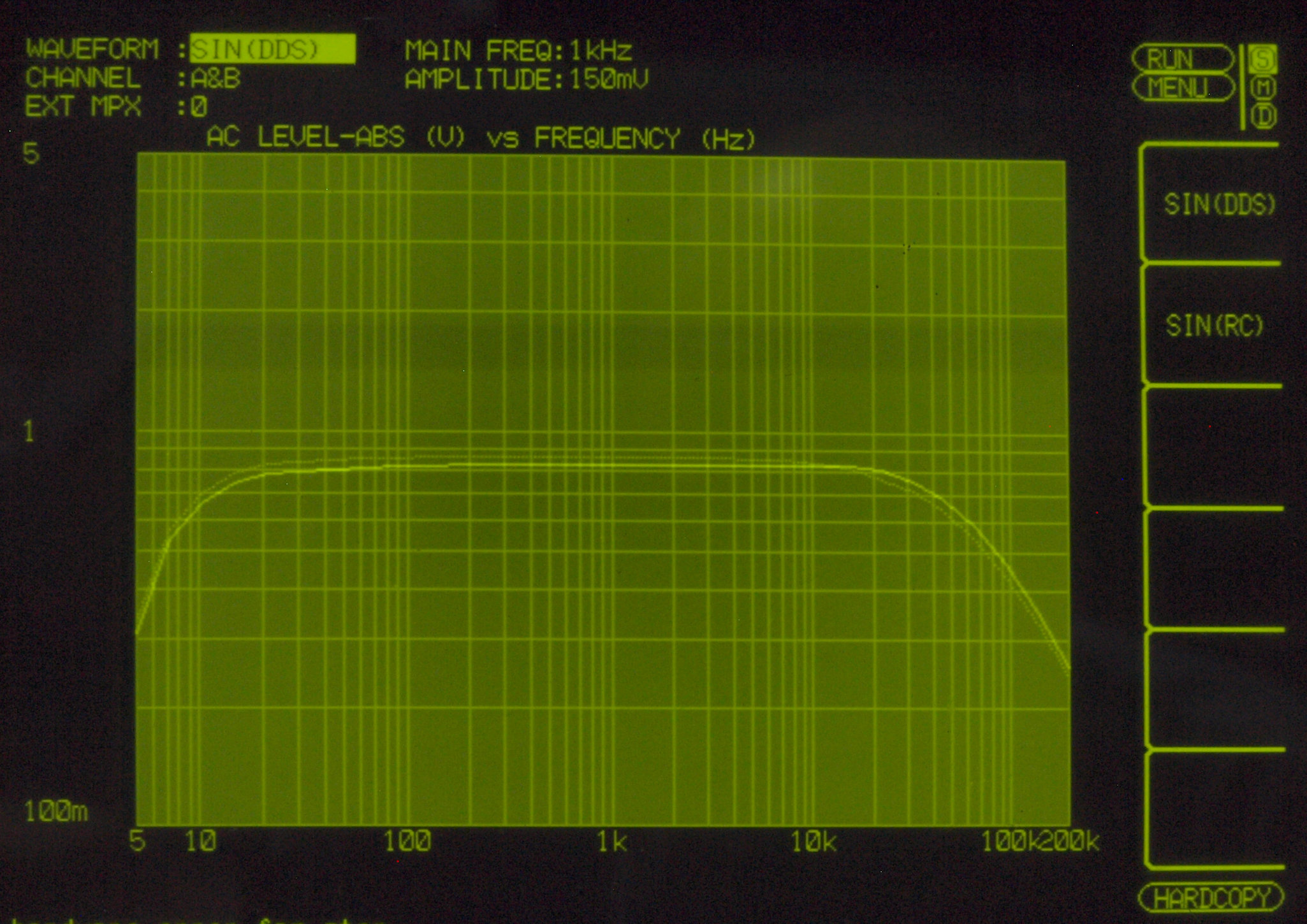 AUX入力端子へ150mV一定入力、VRはmax、左出力=薄(細い)色 右出力=濃い(太い)色。