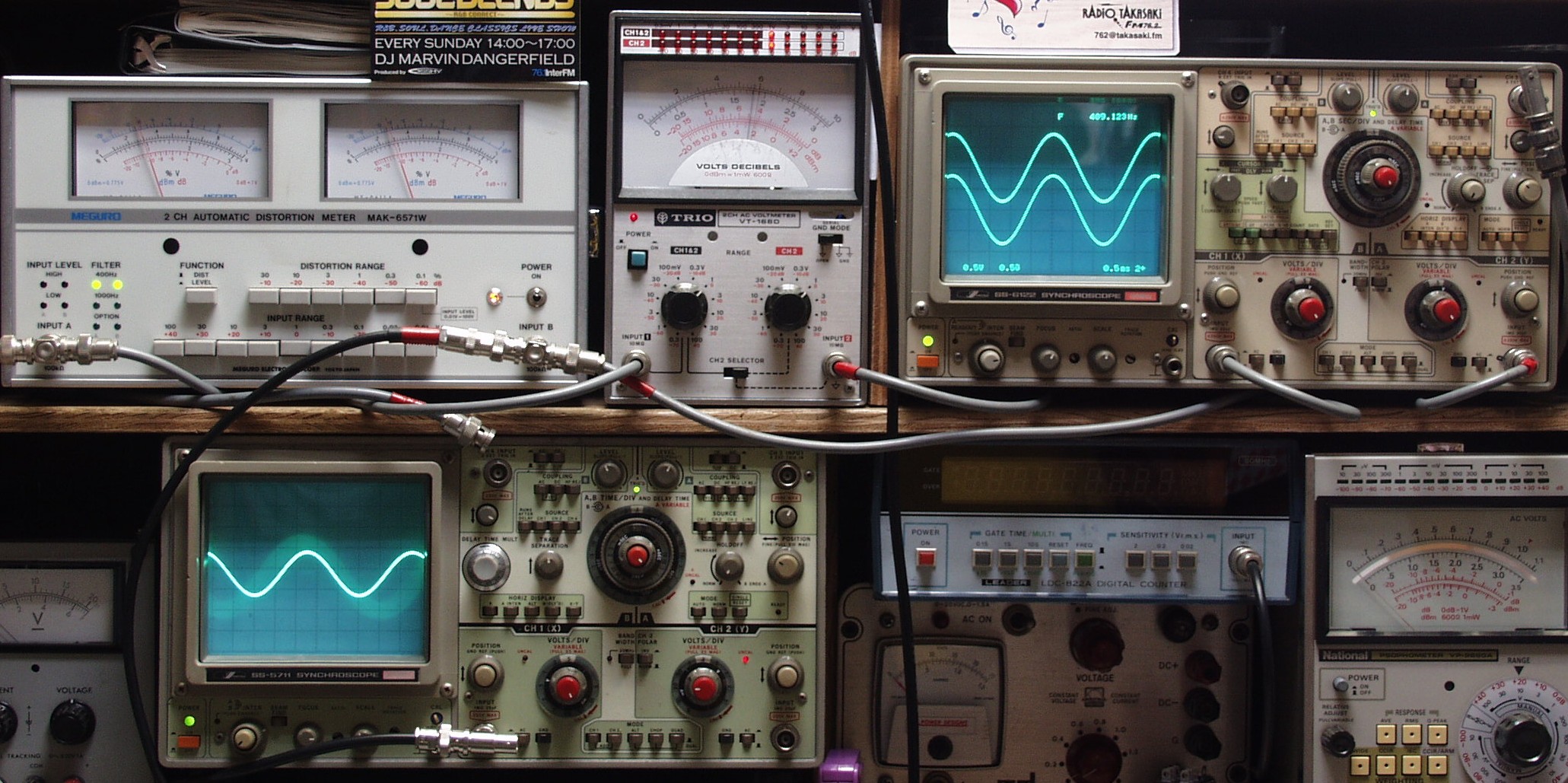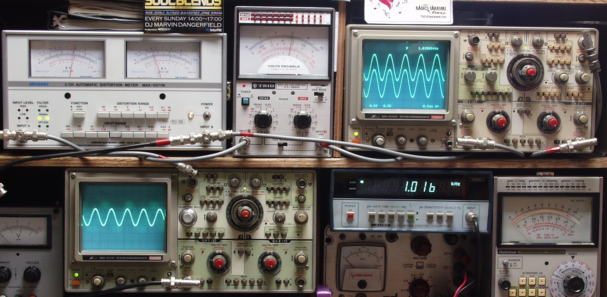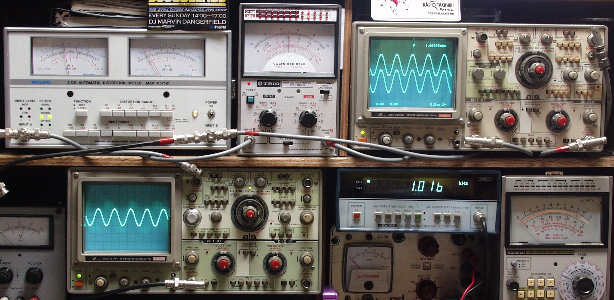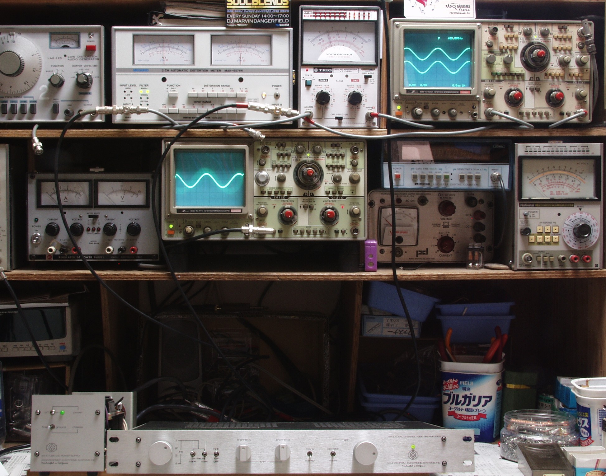 | E. 調整・測定 E1.調整・出力測定 <見方> 上左オーデオ発振器より400HZ・1KHZの信号を出す(歪み率=約0.003%) 下中=入力波形(オーデオ発振器のTTLレベル) 下右=周波数計 上左=SP出力の歪み率測定 左メ−タ−=L出力、右メ−タ−=R出力 上中=SP出力電圧測定器、赤針=R出力、黒針=L出力 上右=SP出力波形オシロ 上=R出力、下=L出力(出力電圧測定器の出力) |