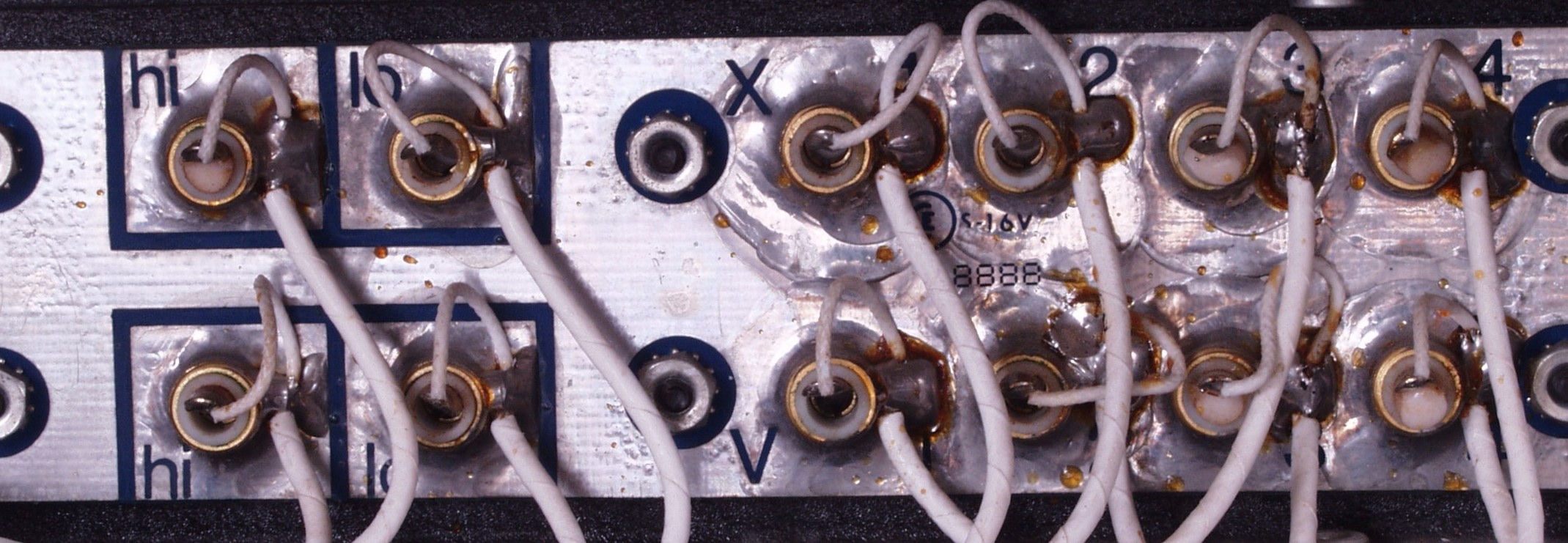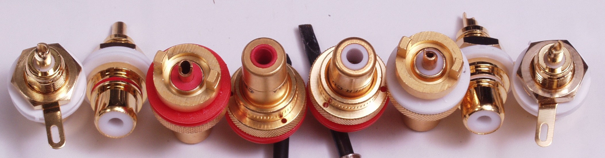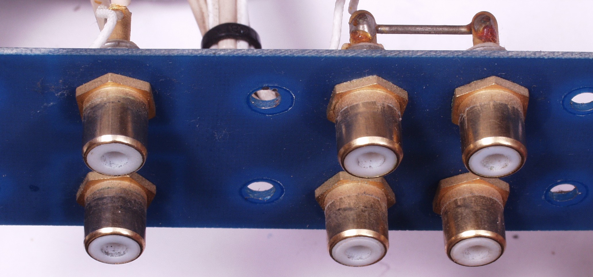 | A34. 点検中 上=ユーザーから送られてきたRCA端子、外ネジタイプ、シャシから絶縁しにくいし、絶縁が薄い 下=小生が良く使用する内ネジタイプ |