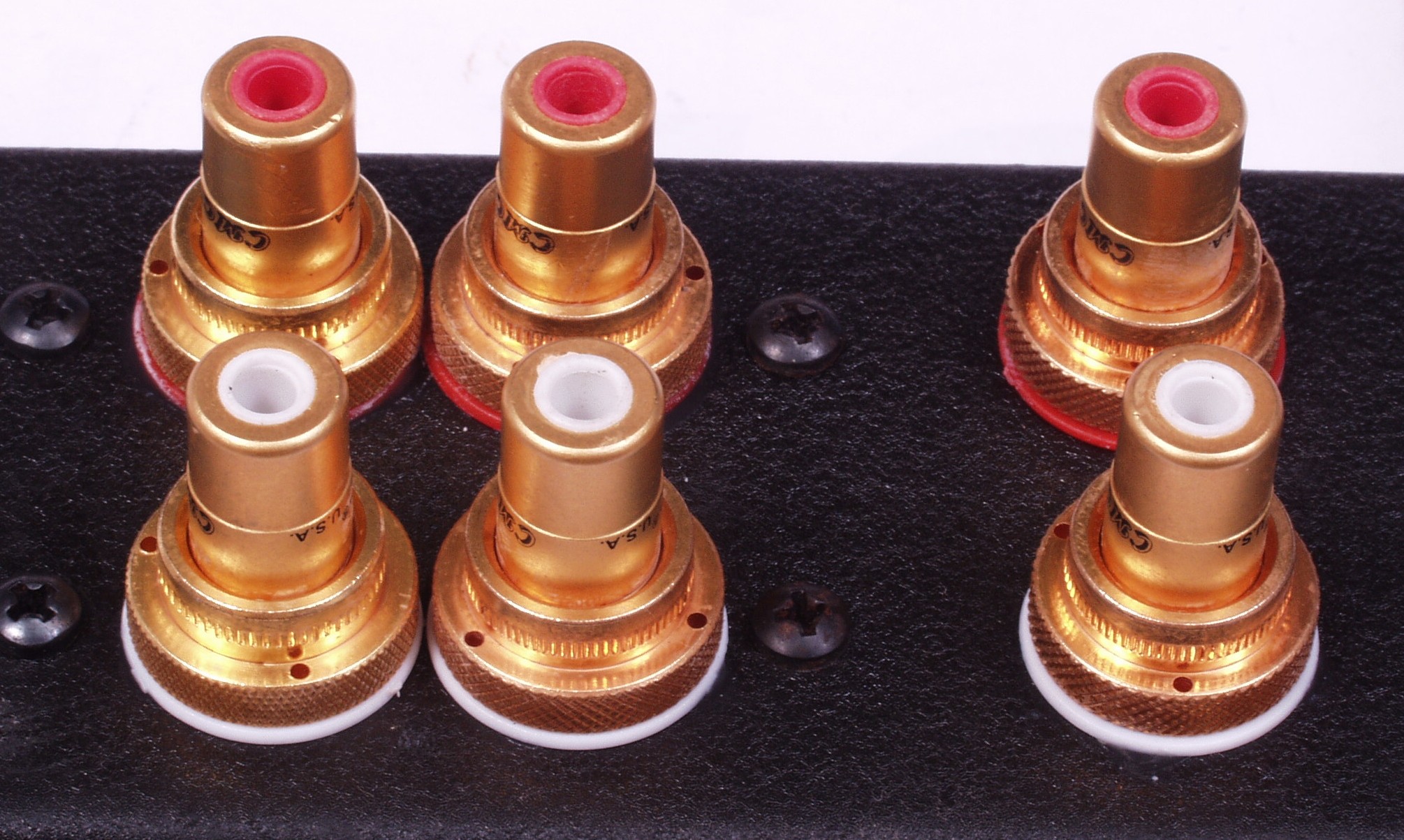 | A35. 点検中 中=ユーザーから送られてきたRCA端子、赤色の方はテフロンで無い 外=小生が良く使用する物両方テフロン使用 |