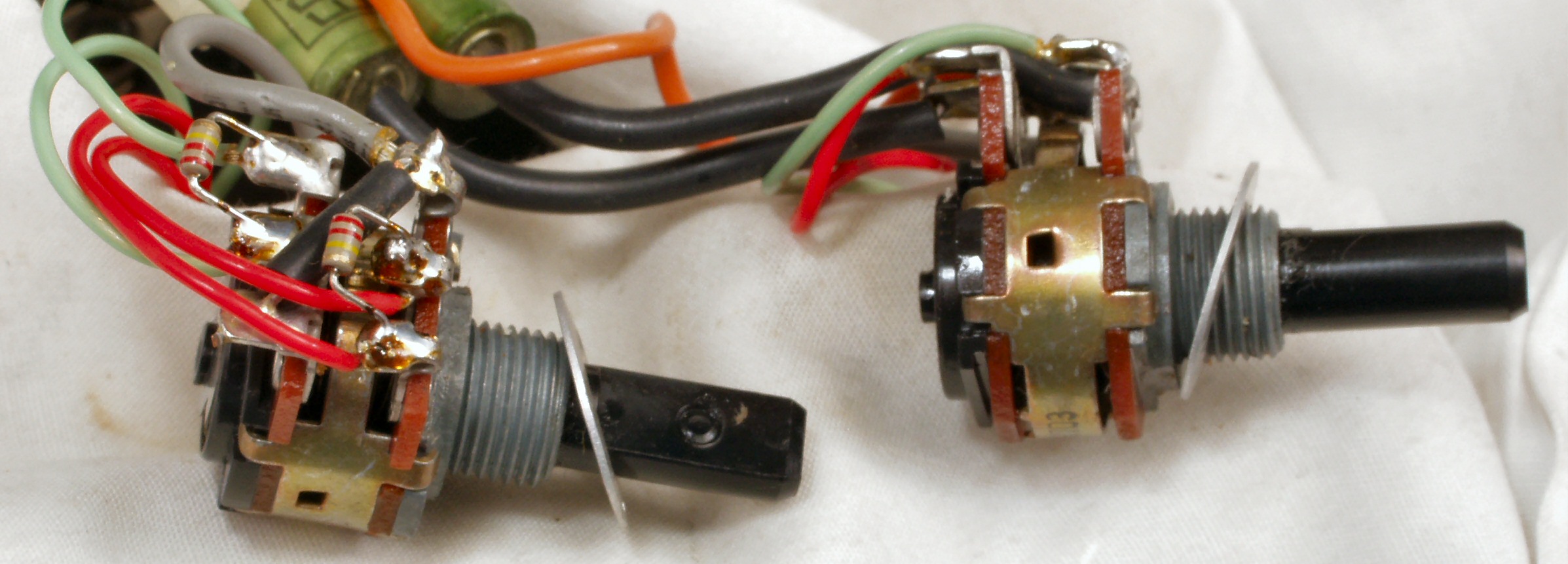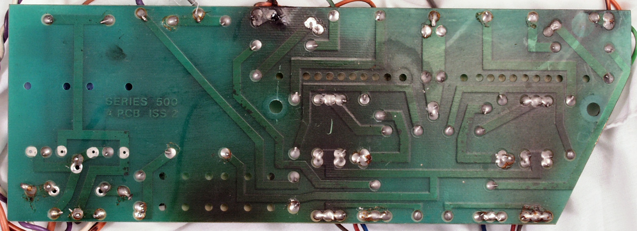 | A−5B. 修理前点検中. 基板したの焼けて交換した抵抗。RLで異なる。配線も「半田コテ」で傷つけている。 プロの仕事とは、到底思えない? |