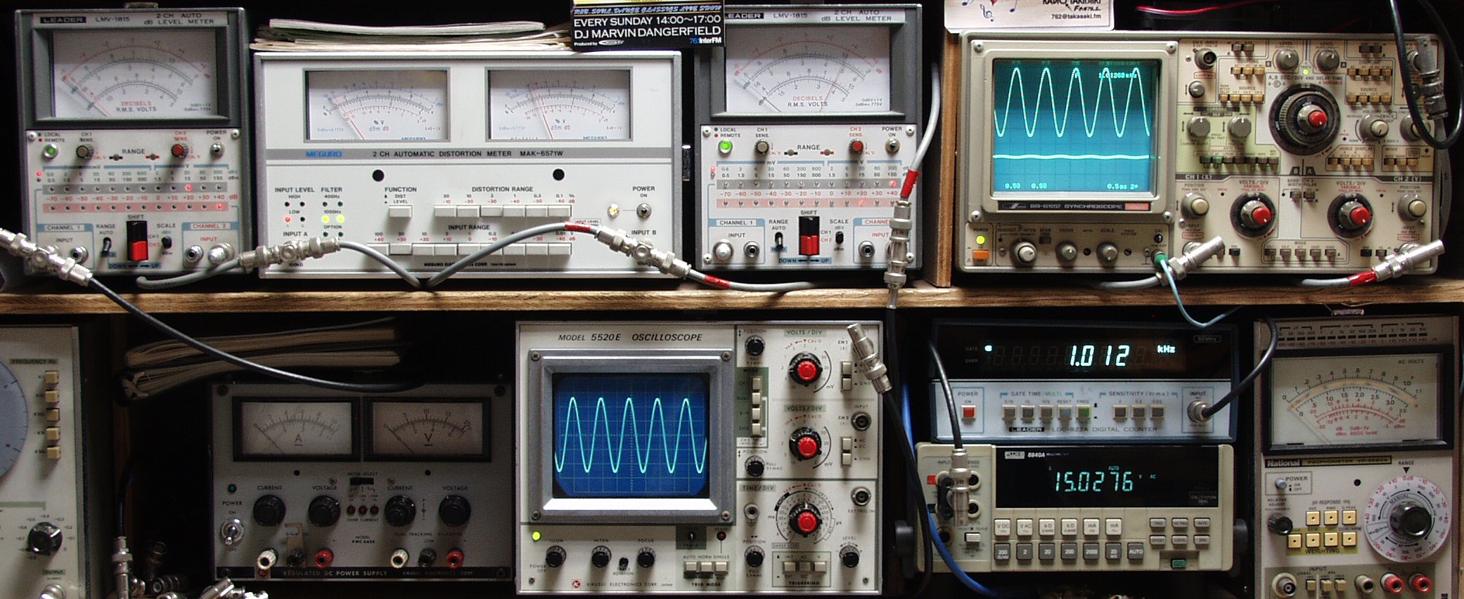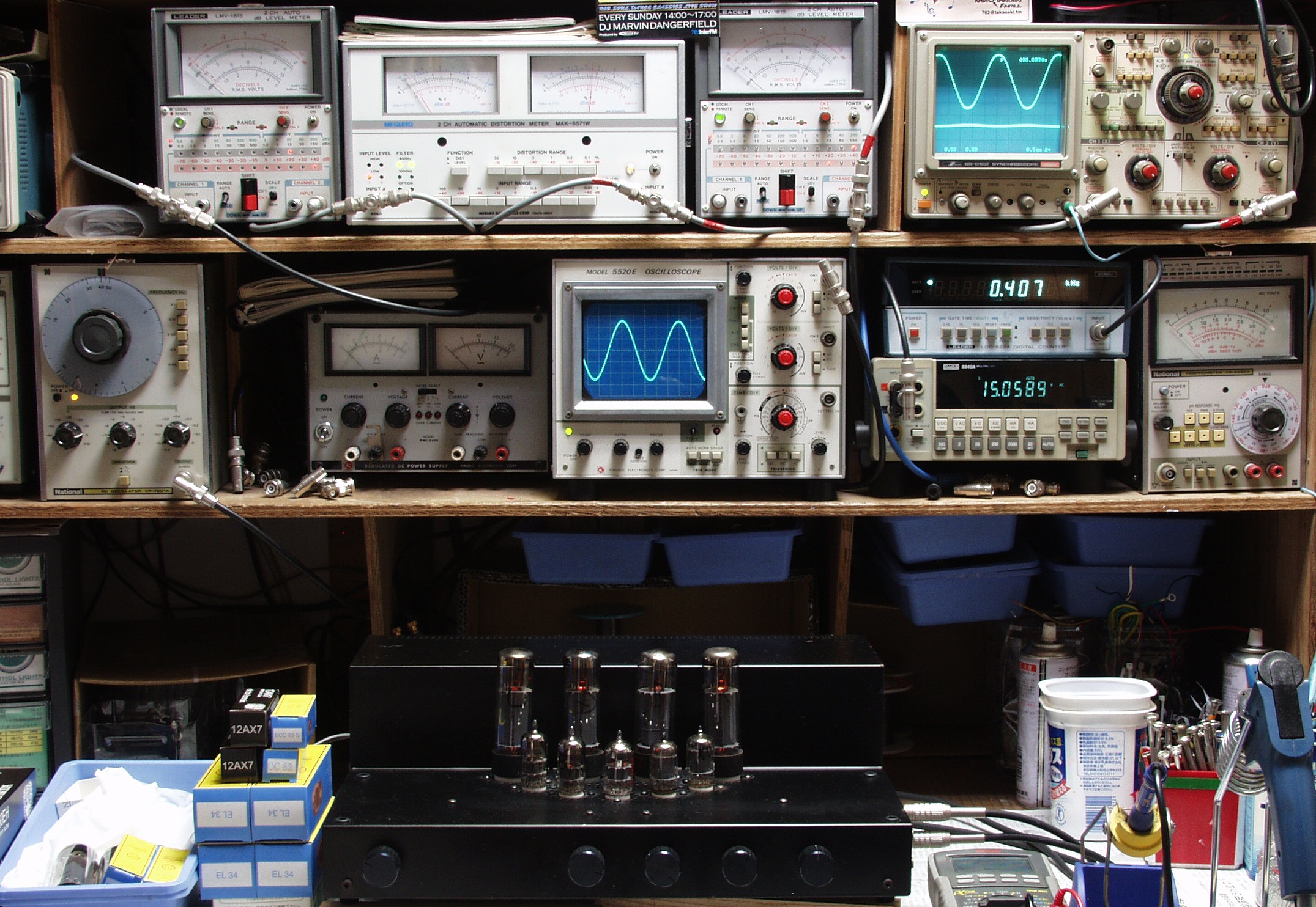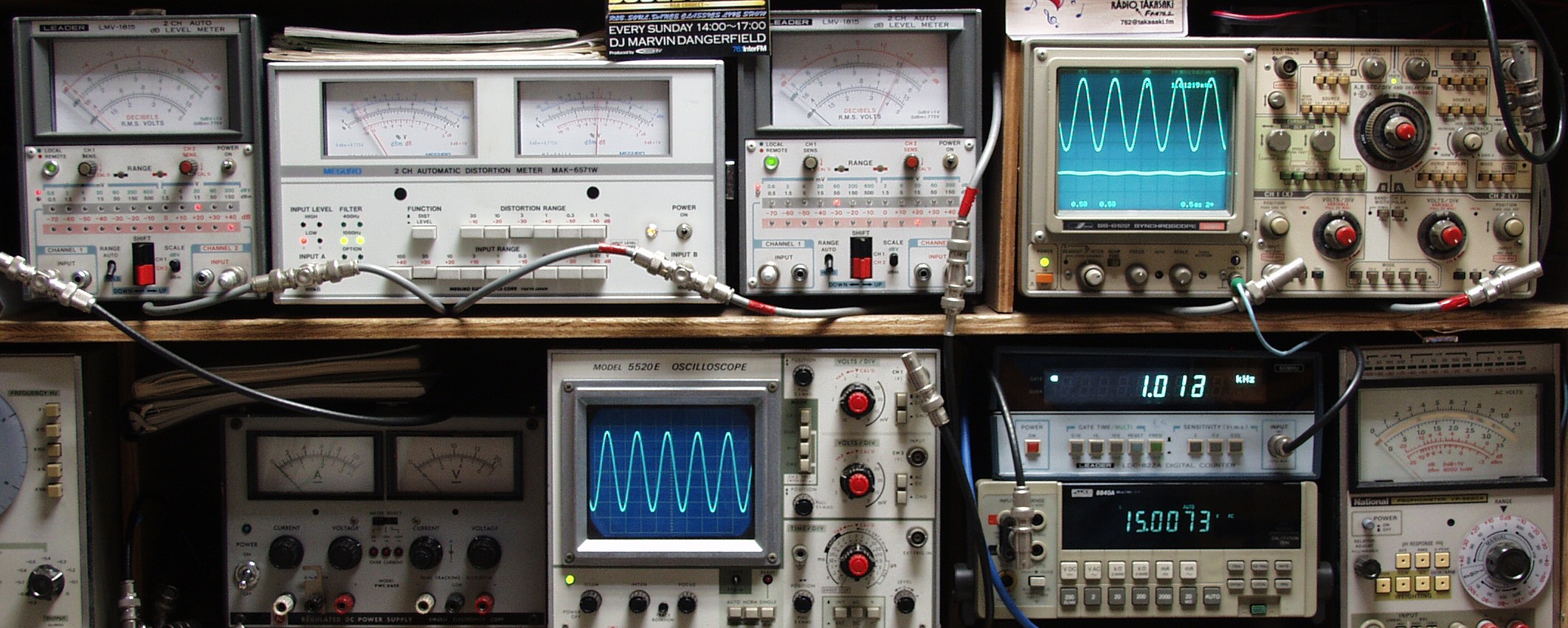 | E. 測定・調整 E−1. 出力・歪み率測定・調整 <見方> 下左オーディオ発振器より400HZ・1KHZの信号を出し(歪み率=約0.003%)これをAMPに入力し、SPからの出力を測定 下中オシロ=入力波形(オーディオ発振器のTTLレベル) 下右上=周波数計 上左端電圧計=L側SP出力電圧測定、黒針のみ使用 上中左歪み率計=SP出力の歪み率測定 左メータ=L出力、右メータ=R出力 上中右=R側SP出力電圧測定、赤針のみ使用 上右端オシロ=SP出力波形 上=R出力、下=L出力 下中右上デジタル電圧計=SP出力電圧測定RLは切り替えて測定 |