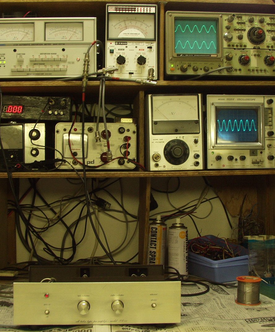 4. 出力測定 1V 歪み率0.09% MM入力=右下オシロ=1000HZ