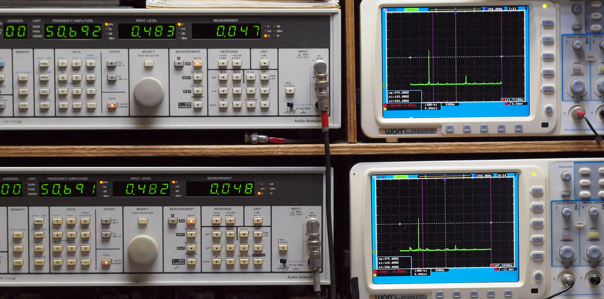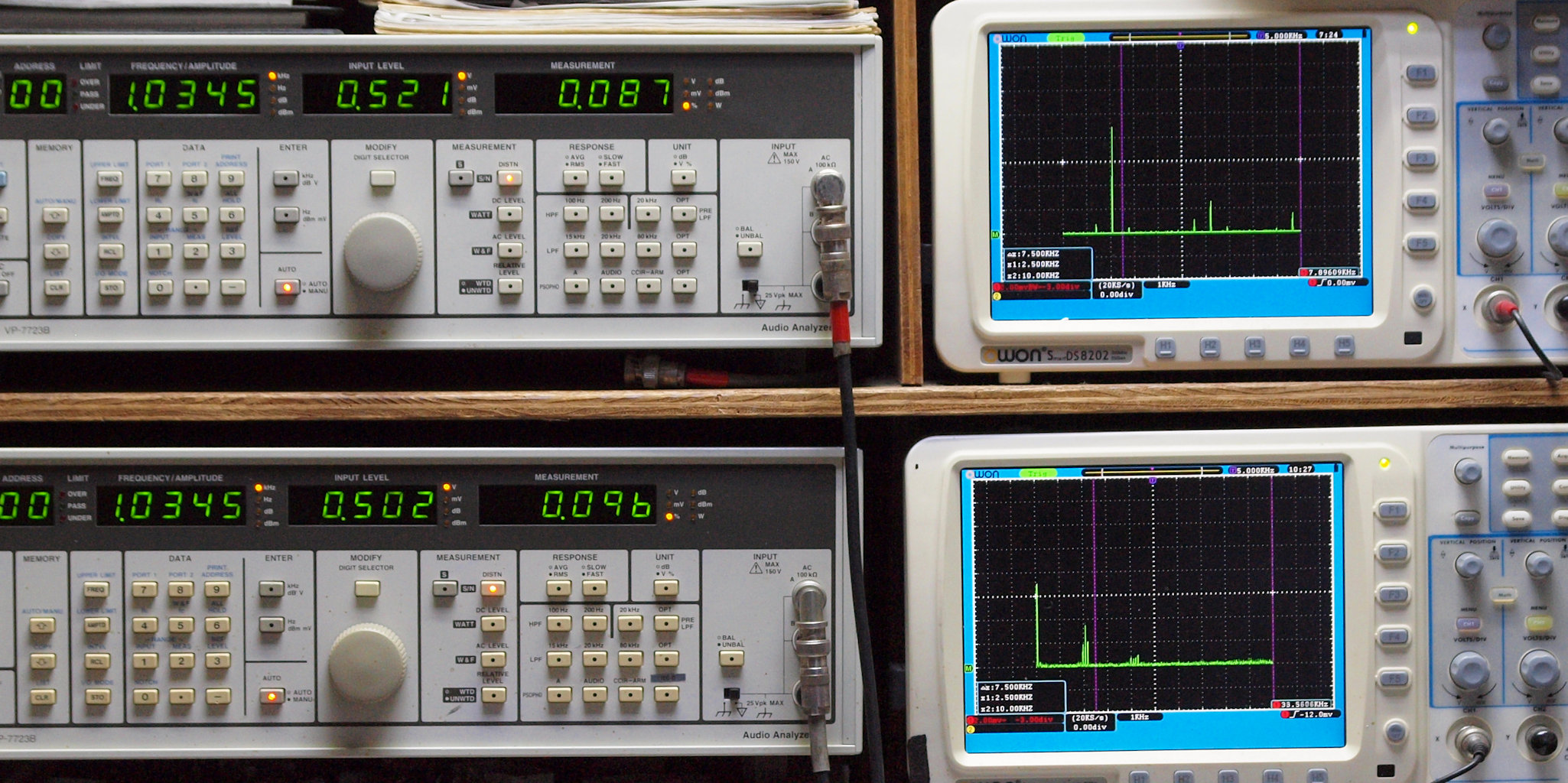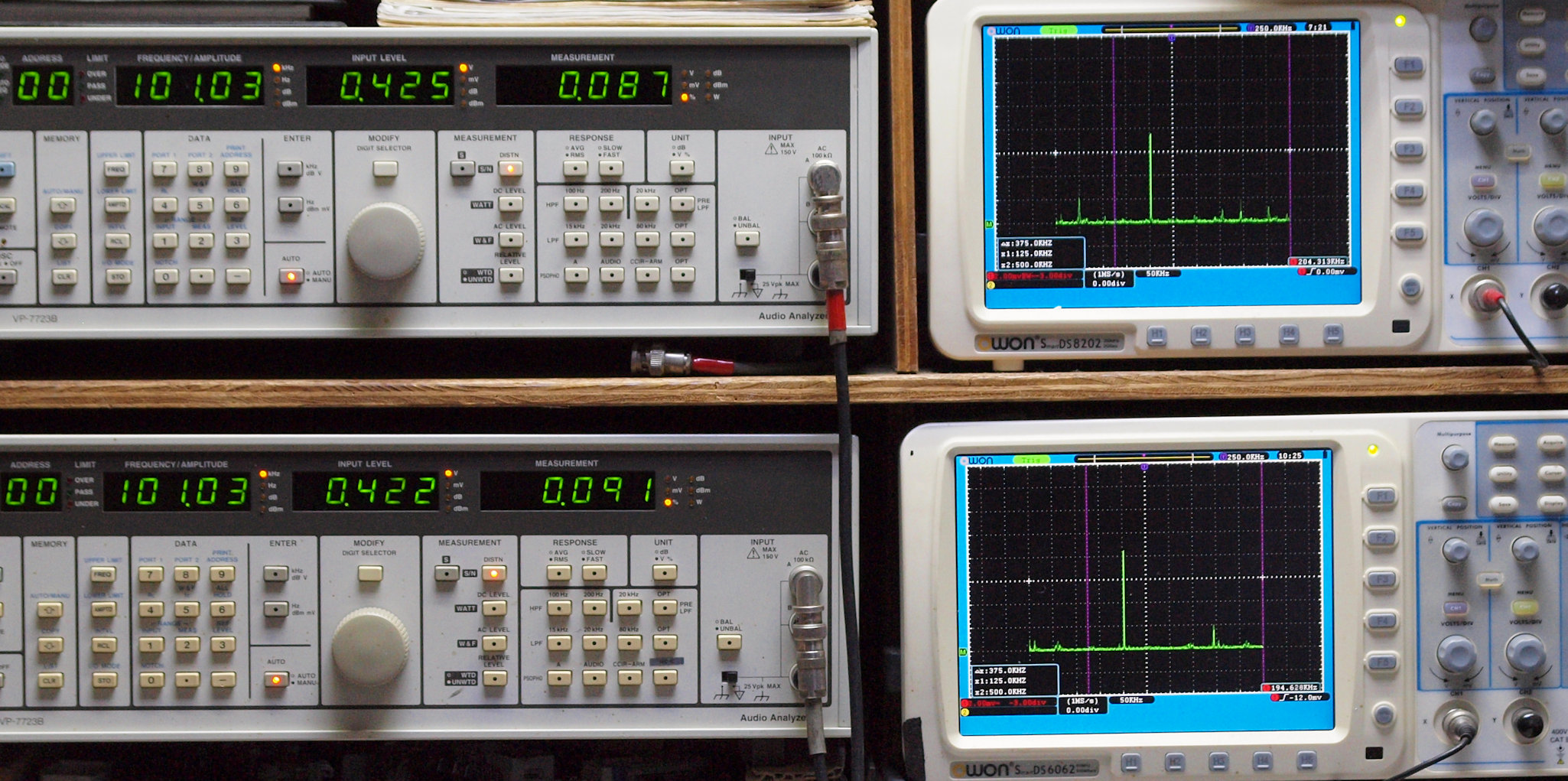 上段右端 VP−7723Bの基本波除去出力を「owon SDS8202(200MHZ)」で「FFT分析」表示。