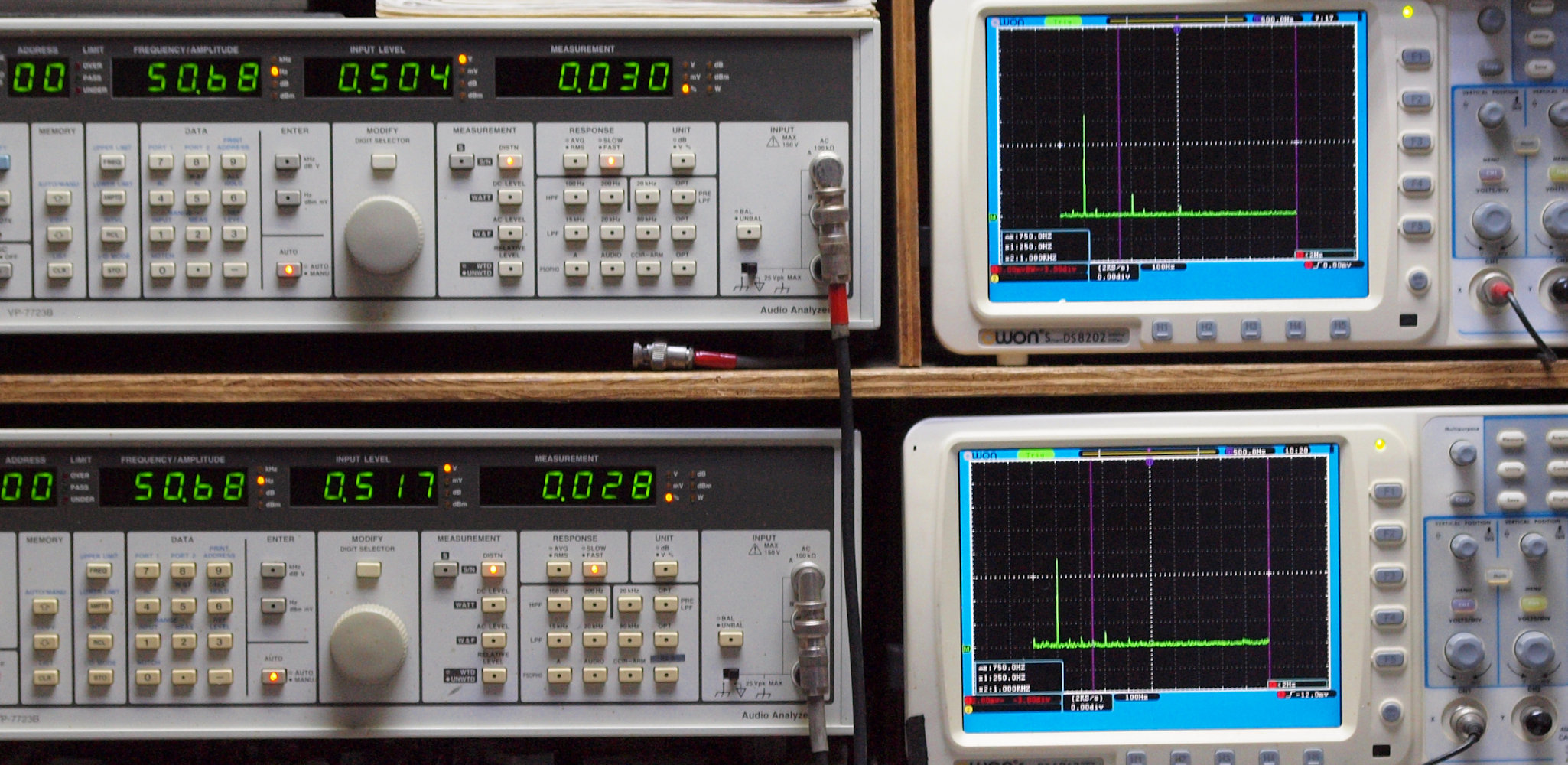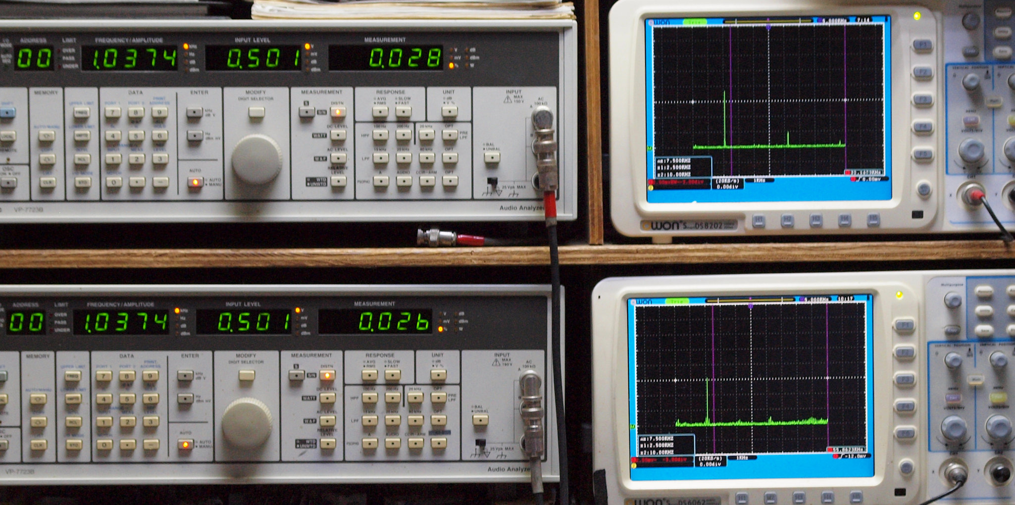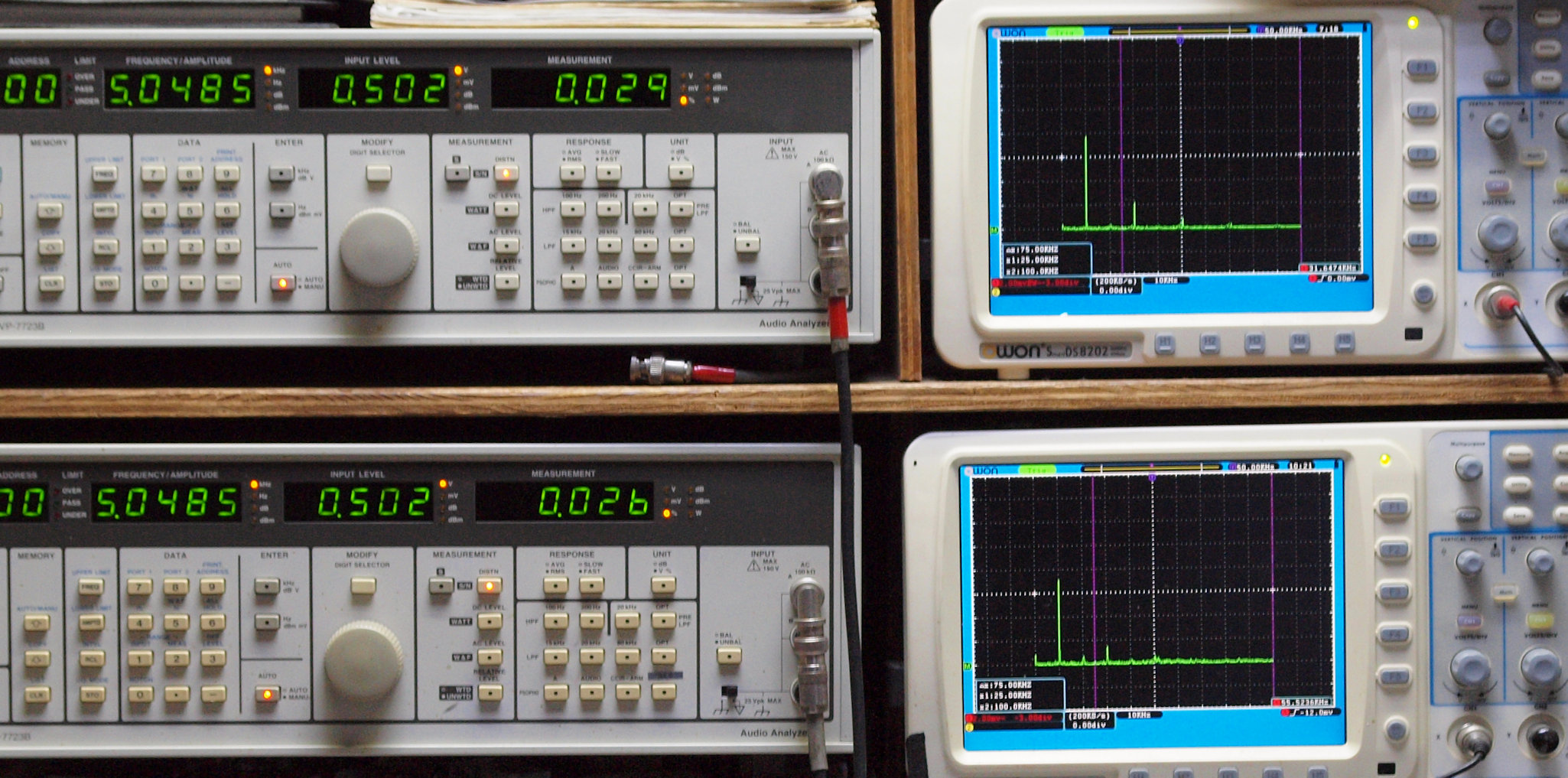 上段右端 VP−7723Bの基本波除去出力を「owon SDS8202(200MHZ)」で「FFT分析」表示。