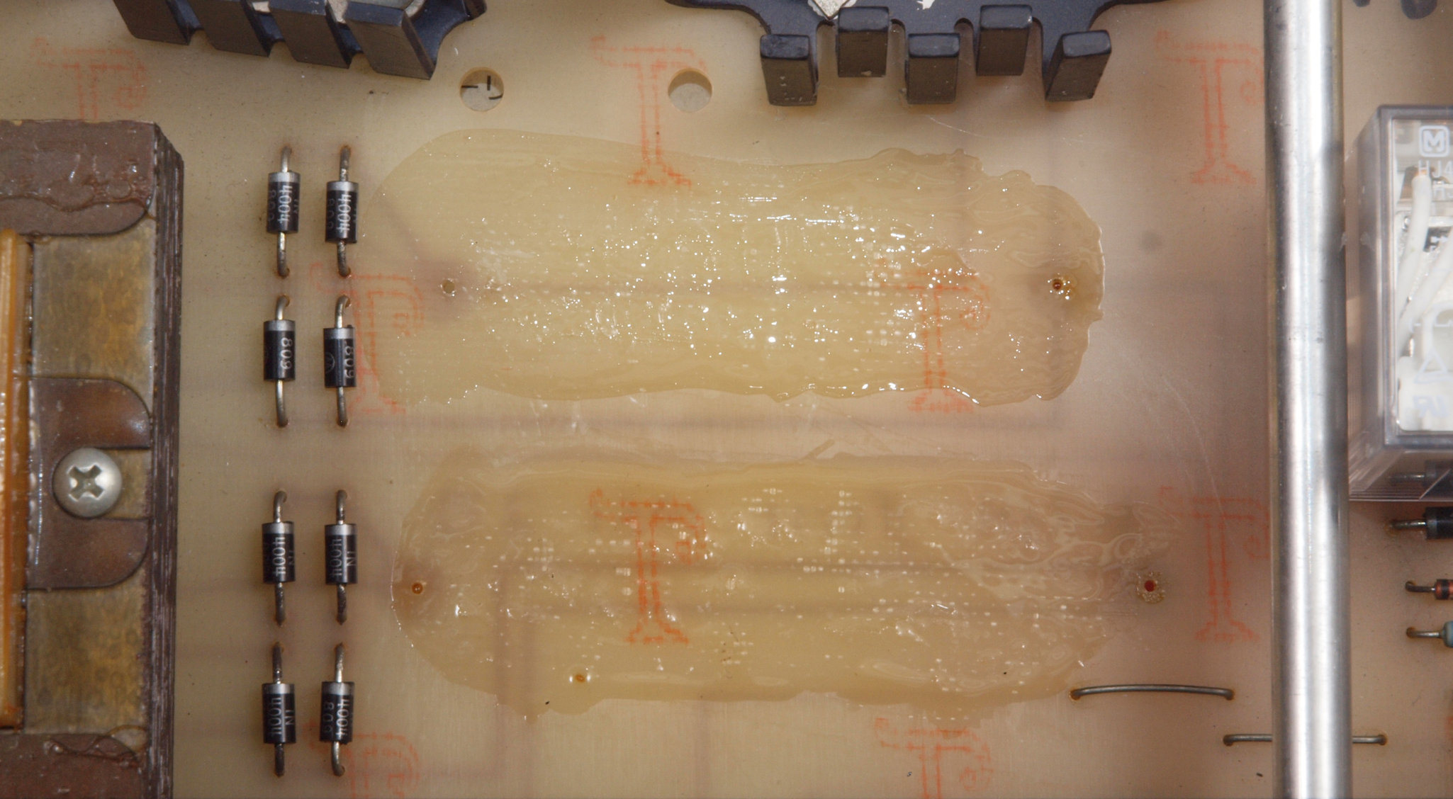 C115. 修理中 基板。 電解コンデンサー固定接着剤2を取り去り、コートを塗布後。